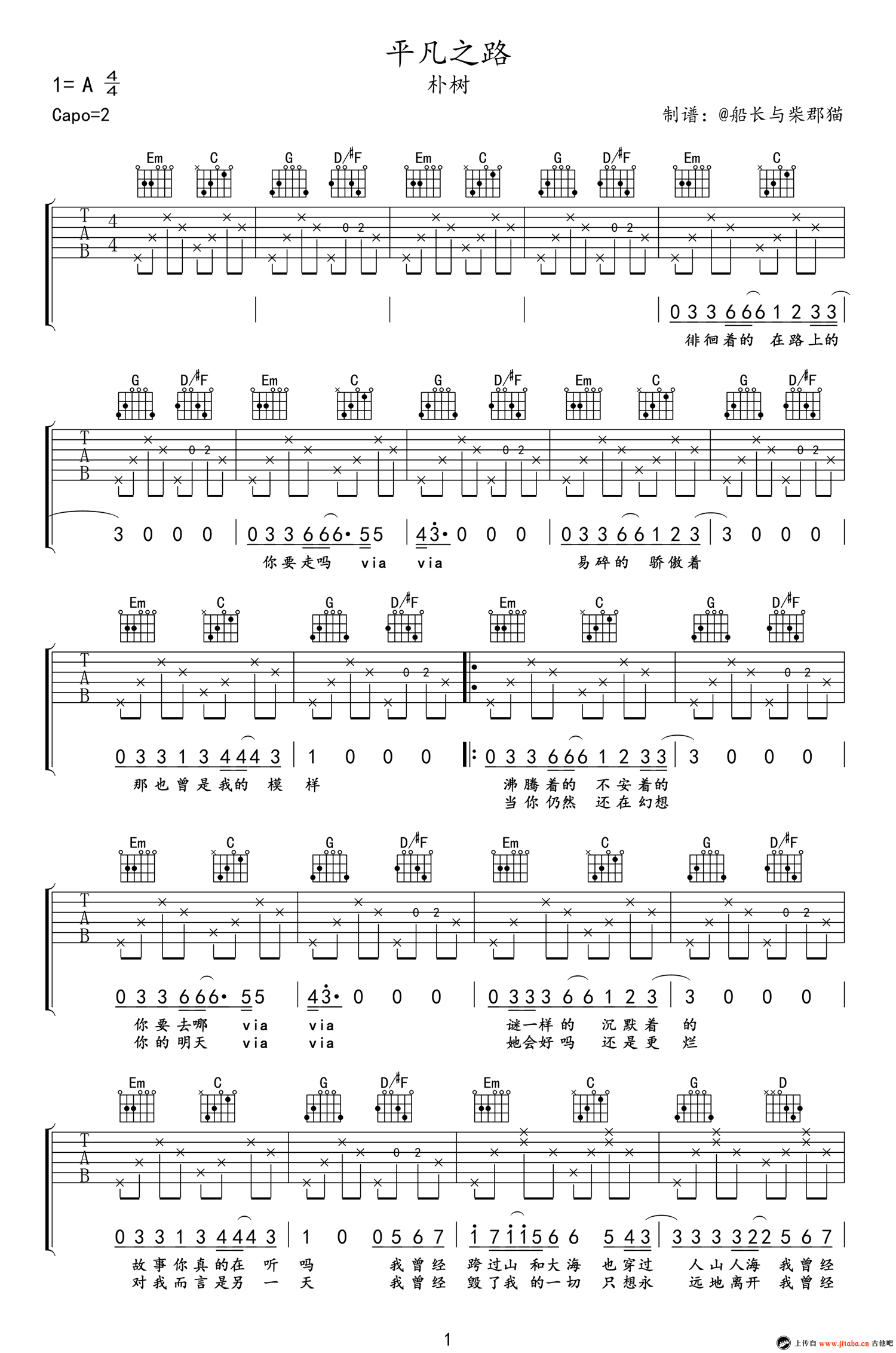 曲谱介绍: 平凡之路吉他谱,朴树演唱,capo夹二品,平凡之路吉他弹唱谱,高清图片谱。感谢@船长与柴郡猫制谱分享。 都市丛林中的行吟诗人朴树为电影《后会无期》创作并献唱的主题曲《平凡之路》广受欢迎。花与树,自己与世界,朴树的歌唱简简单单,却从不平凡。