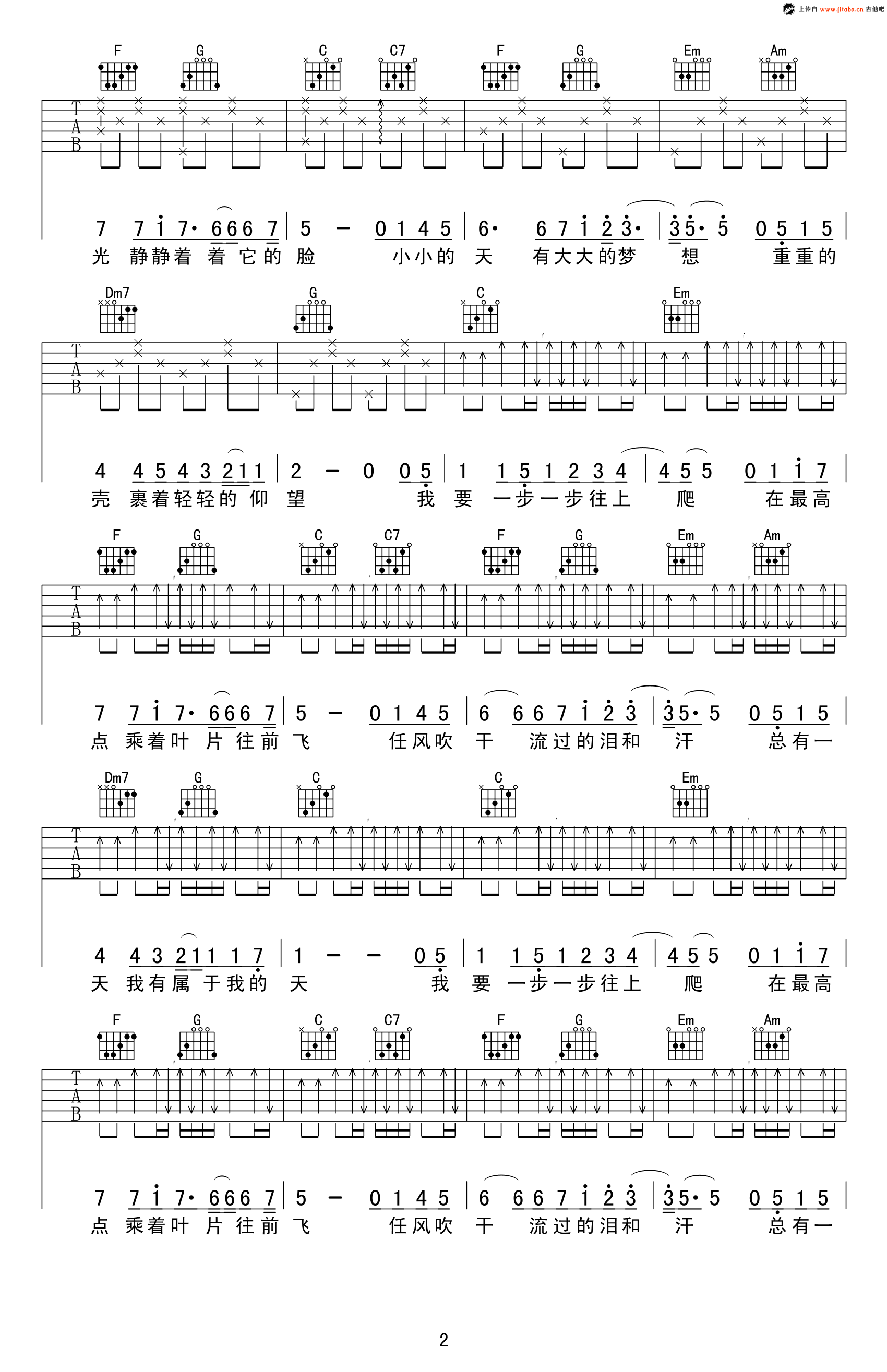 曲谱介绍: 蜗牛吉他谱,周杰伦演唱的一首励志歌曲,蜗牛六线谱,C调指法,CAPO建议2-7品,琴友们根据音域选择品位。曲谱为高清版图片谱,三张谱例,又又吉他编配。 小小的天,有大大的梦想,总有一天,我有属于我的天。这首正能量的歌永远能戳到人的泪点,在艰难的时候听着它,从简单的旋律里获取力量。