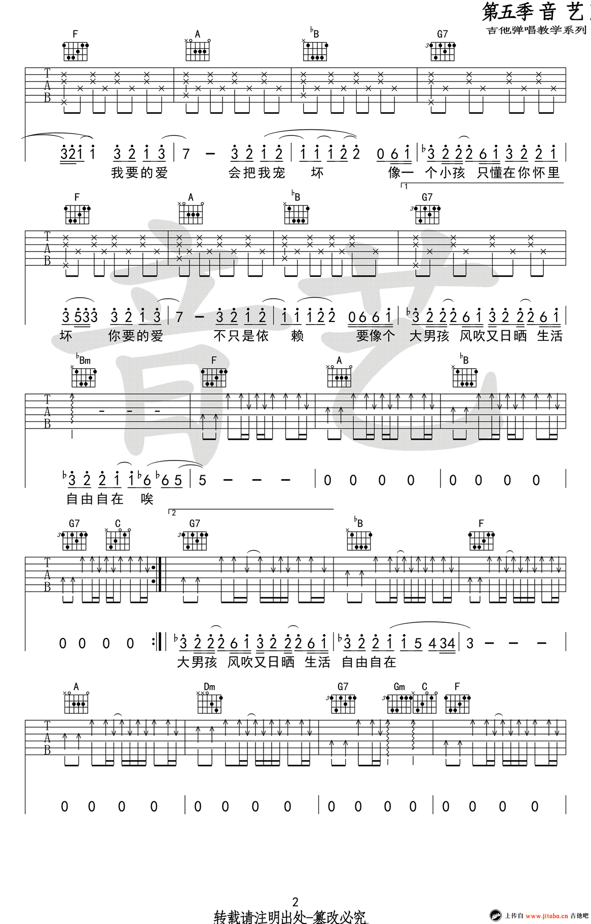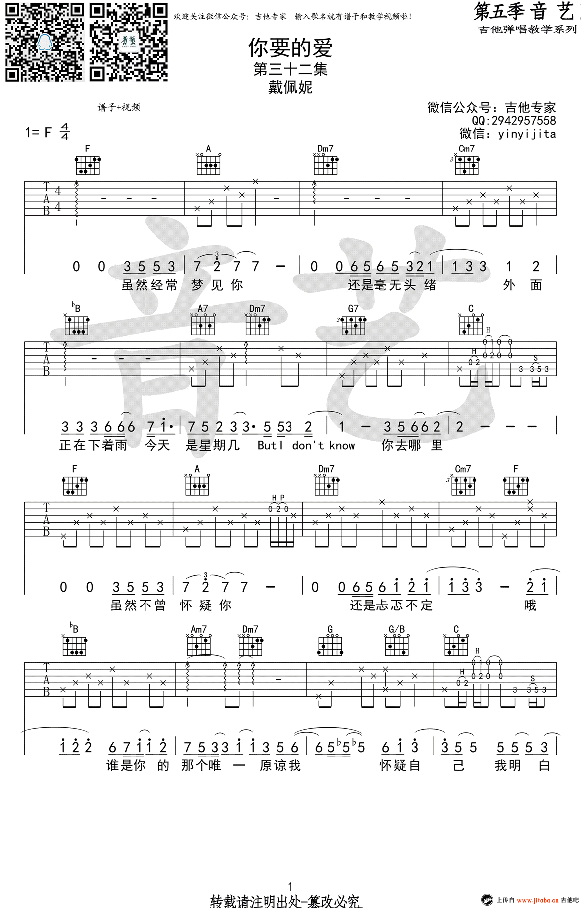 曲谱介绍: 戴佩妮《你要的爱》吉他谱,F调编配,你要的爱吉他弹唱谱,高清版六线谱,四张图片谱两页显示,感谢音艺吉他教学制谱分享。 《流星花园》电视剧片尾曲,一首回忆杀的经典情歌,想起了F4和那个杉菜,那个青春时光,肆无忌惮歌唱的日子!
