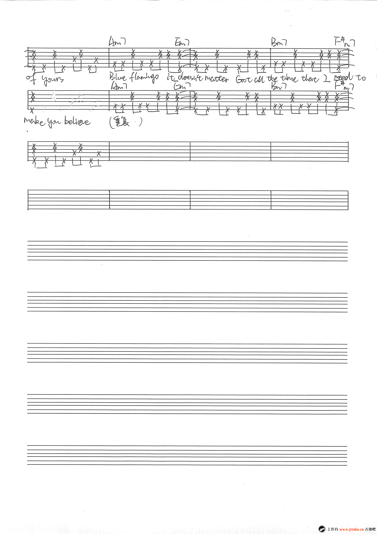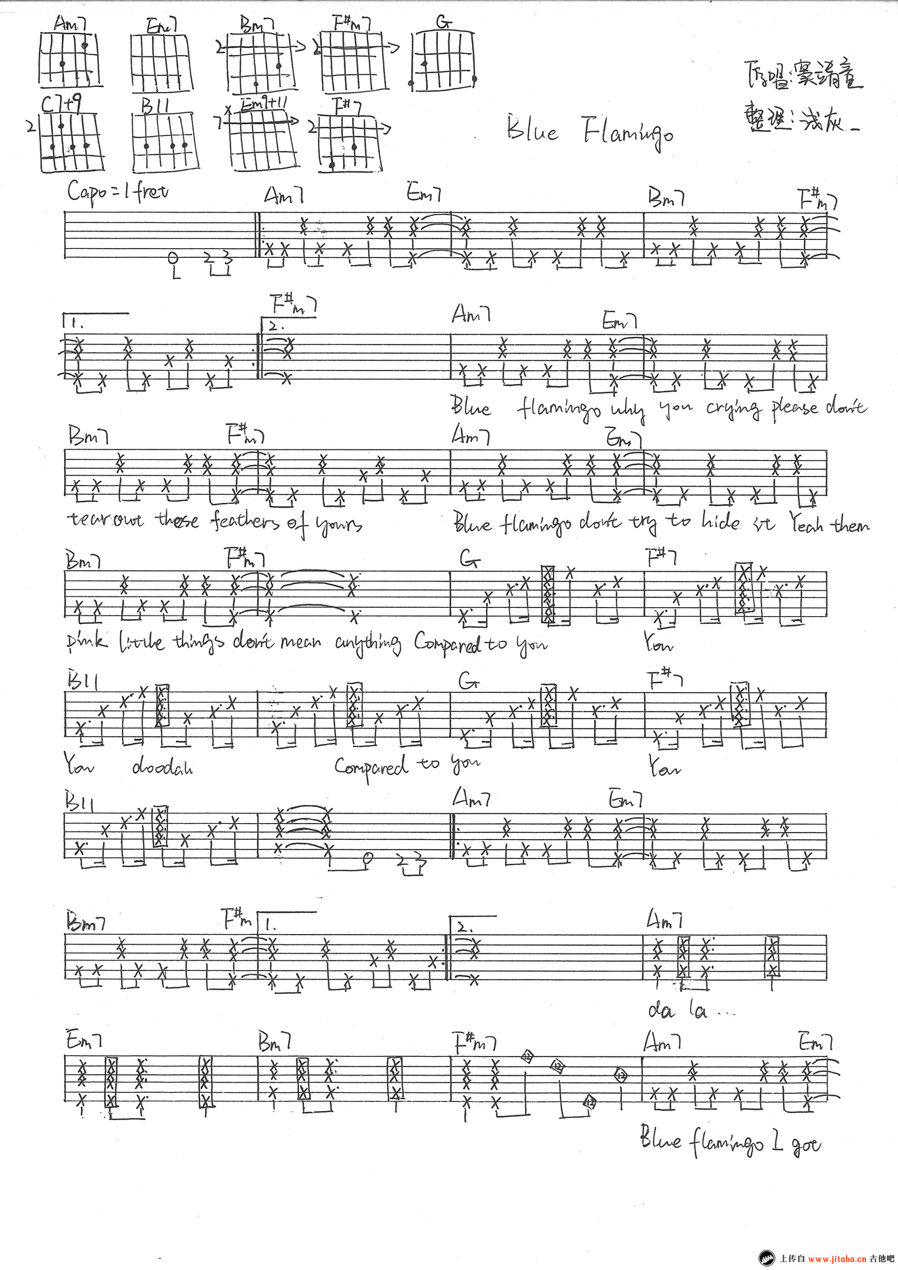 曲谱介绍: 窦靖童的Blue Flamingo吉他谱,Capo夹一品,三张图片谱手写版编配,Blue Flamingo吉他弹唱谱,感谢浅灰整理分享。 窦靖童的一首词曲原创歌曲,干净清澈的声线,让人听起来很很舒服。
