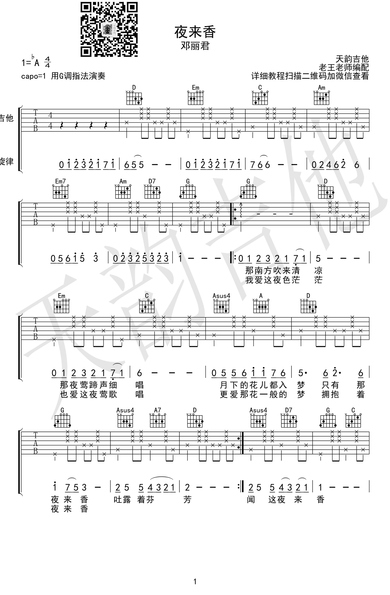 曲谱介绍: 邓丽君《夜来香》吉他谱,原调bA,Capo夹一品,用G调指法演奏。夜来香吉他弹唱谱,高清版六线谱两张图片,曲谱由天韵吉他编配出品。 一首老歌金曲,邓丽君的柔美清丽的歌声,恰似飘来阵阵夜来香,令人沉浸和陶醉,生活有时需要这样的悠闲,让身心的疲惫人在这温婉的旋律中彻底松下来。