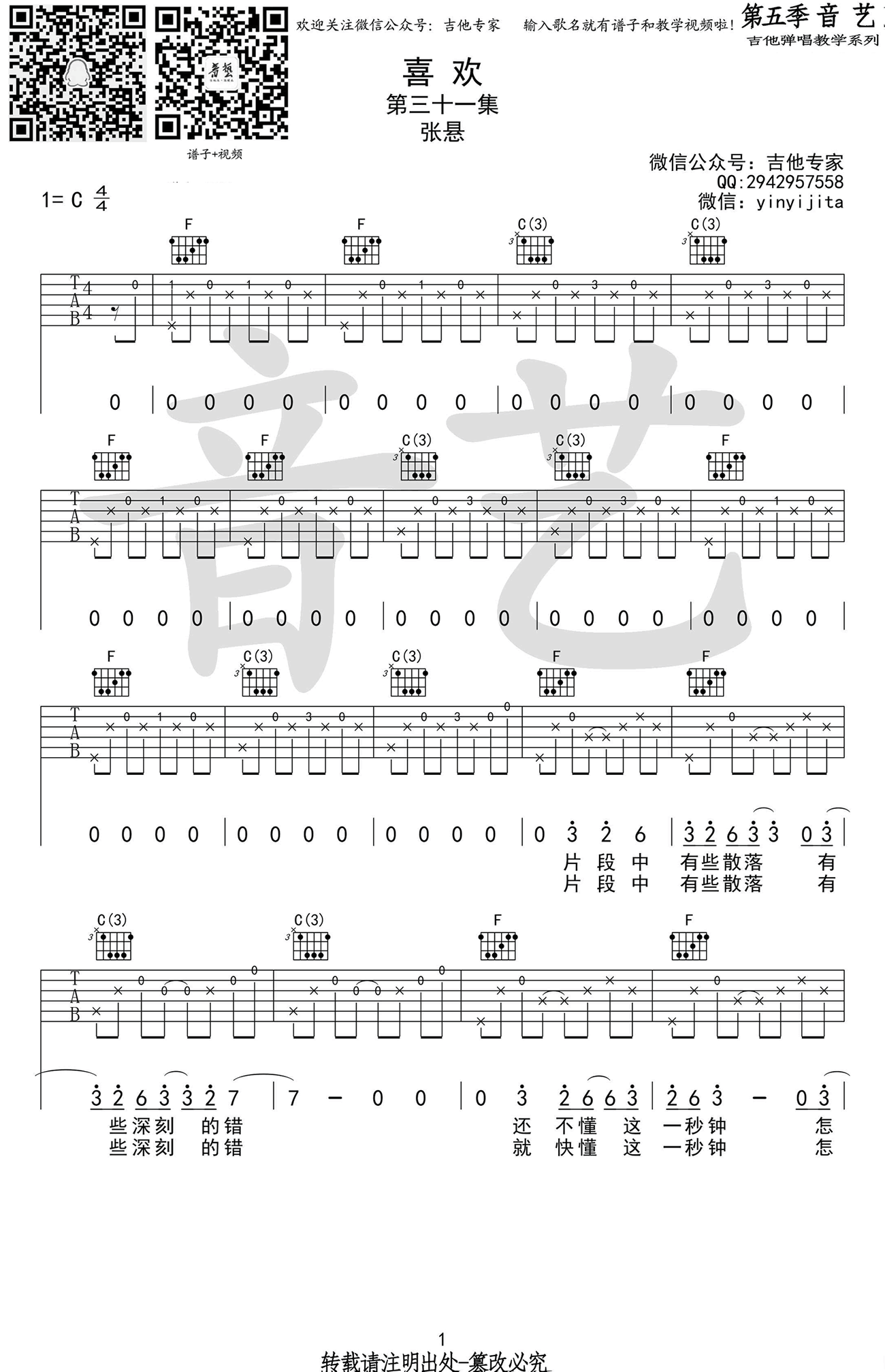 曲谱介绍: 张悬喜欢吉他谱,C调指法,喜欢吉他六线谱,高清版共四张图片谱例,分两页显示。 喜欢上这种慵懒又不失温暖的曲风,轻柔的吉他淡淡的歌声,唱出的是长长的爱,和沉沉的自我洒脱。 感谢音艺吉他弹唱教学编配出品。