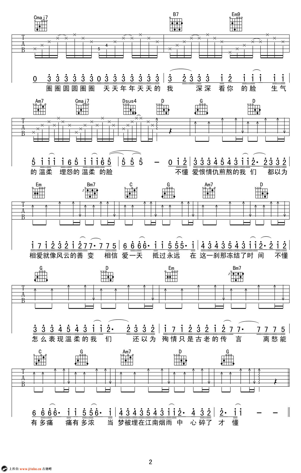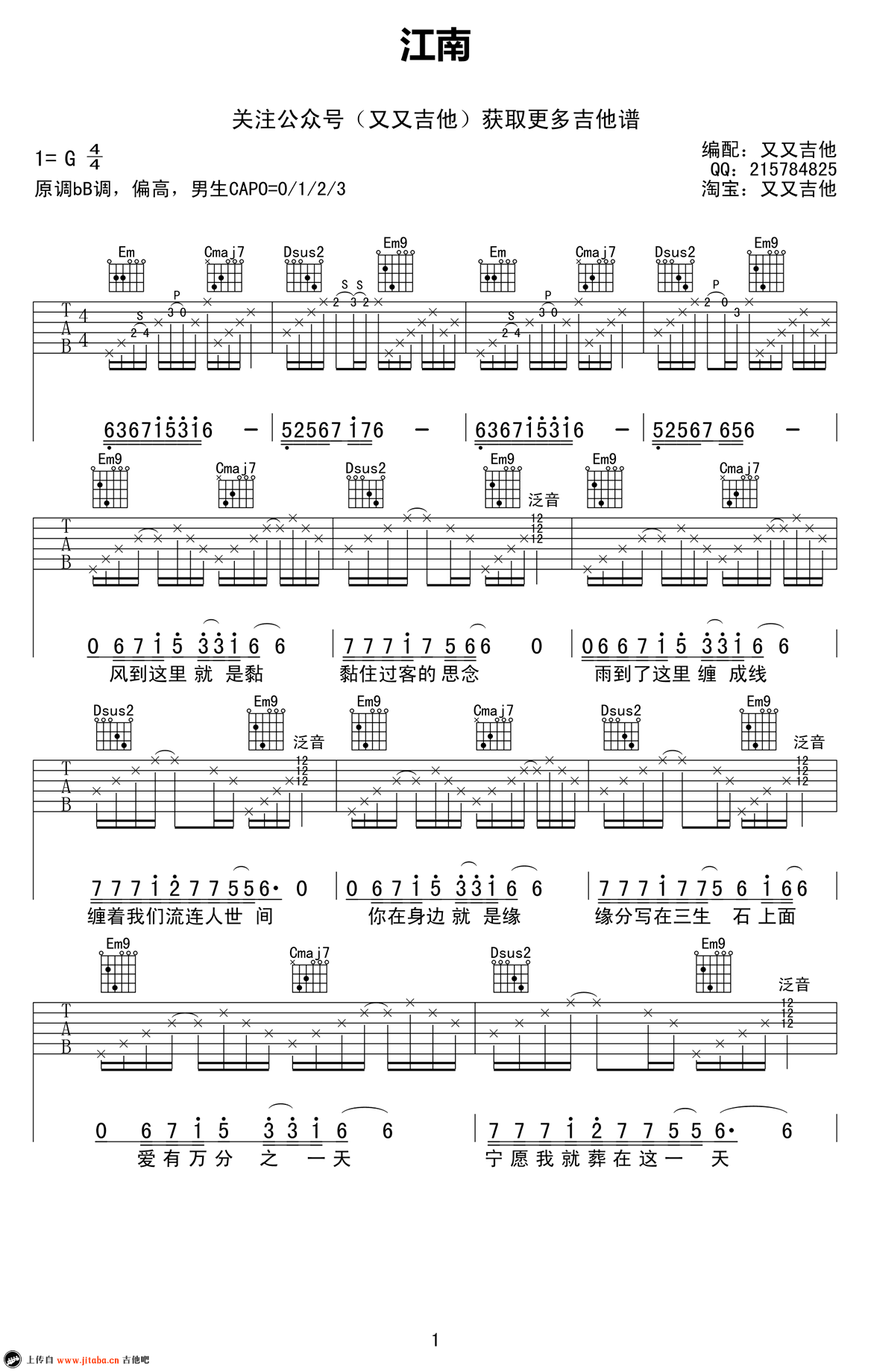 曲谱介绍: 江南吉他谱,林俊杰的一首早期成名代表曲目,红遍大江南北的经典情歌,江南六线谱,高清图片谱。歌曲原调bB调偏高,男生CAPO建议0-3品。感谢又又吉他编配。 爱情自古以来就像江南风云那样的善变,叫人捉摸不定,一曲《江南》,唱出了“融情于景的江南烟雨风味”,歌声哀怨凄美,声声嘹响动人。风雨缠绵悱恻,交织着无数人诉说不清的爱恨情仇与悲欢离合。
