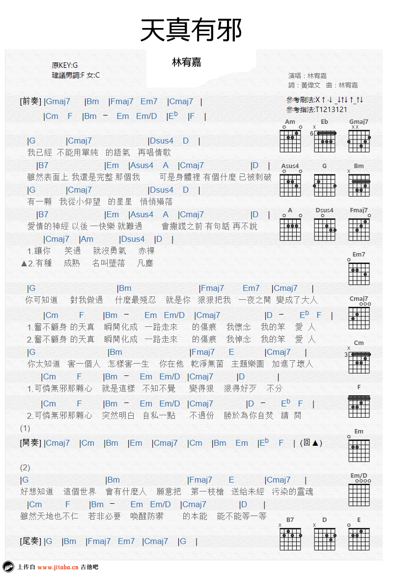 曲谱介绍: 林宥嘉天真有邪吉他谱,和弦编配图片谱,天真有邪吉他弹唱谱,原调G,建议你到F女调C,参考刷法、指法图片谱标注。 从一个天真无邪的人成长为有邪,这个过程的经历大家都大同小异吧,歌曲唱出一个原本天真的人因经历一段刻骨铭心的爱情而成长,我们都是从每一段感情中学会长大,进而变成了一个有故事的人。