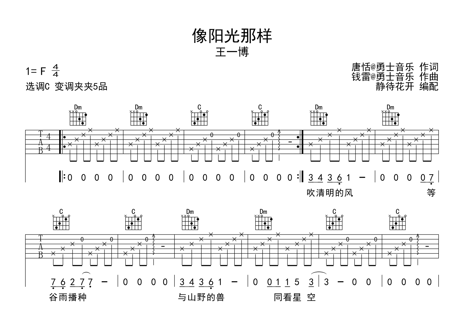 曲谱介绍: 像阳光那样吉他谱,王一博演唱,为这个寒冬增添些许令人宽慰的微暖,为我们点燃希冀的火焰。《像阳光那样》吉他弹唱谱,编配采用C调和弦指法,建议变调夹夹5品,原调F调,速度大约每分钟85拍,演奏难度简单。
