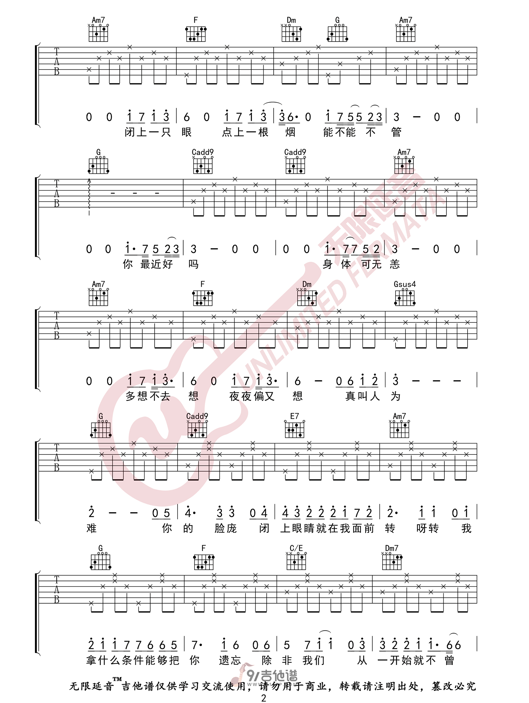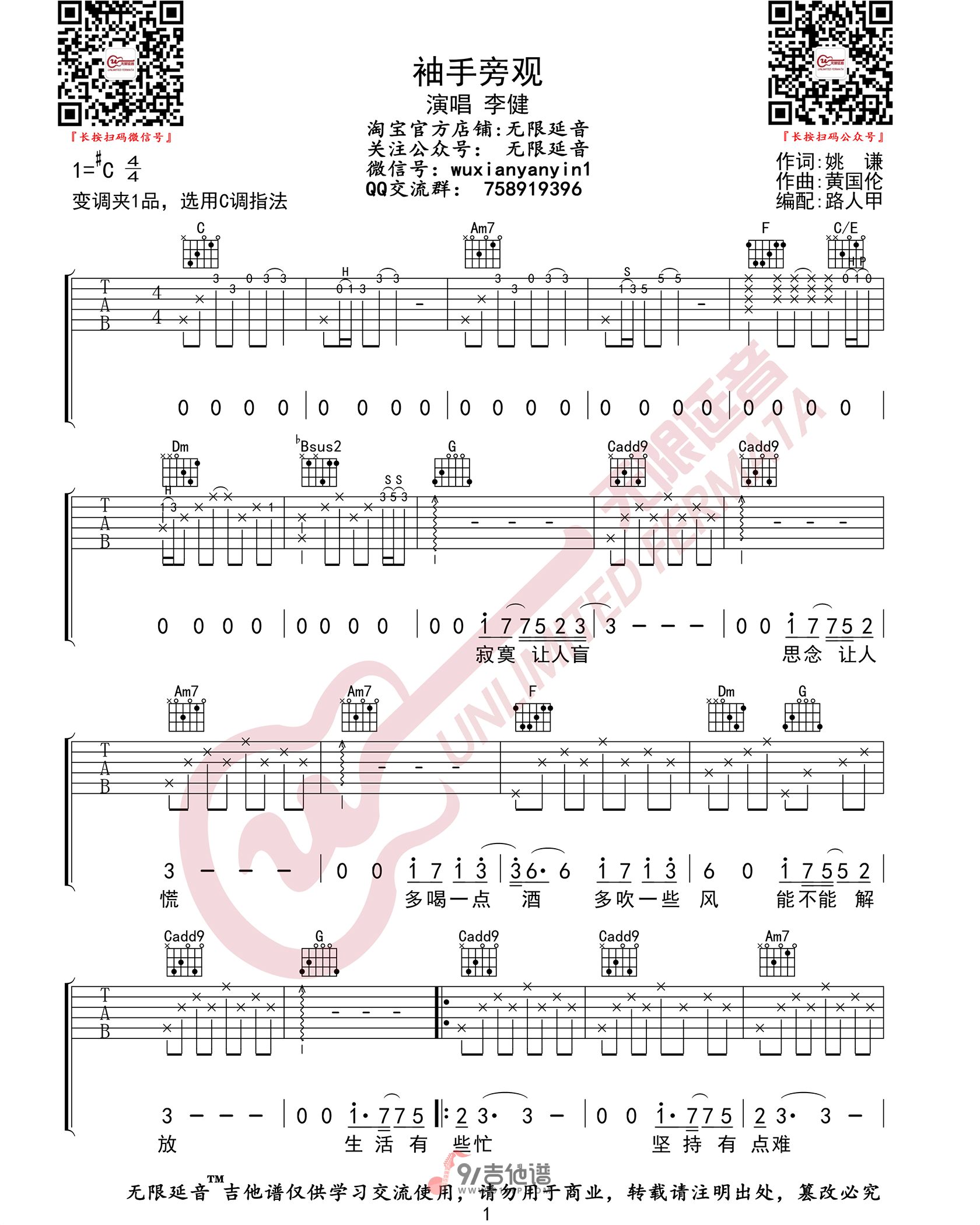 曲谱介绍: 曲谱简介:袖手旁观吉他谱,李健演唱的一首歌曲,4/4拍的节奏,这首歌曲的原调为#C调,这里曲谱采用了C调指法进行编配,演唱时夹变调夹1品可回到原调,也可根据个人实际嗓音情况选择。曲谱由无限延音编配出品。这是一首孤独深情的齐氏情歌,被李健温柔演绎,那些逝去的爱被男神滴水不漏的唱出,男人的痴情在此刻凝结成透亮冰凉。对于一段已成定局的爱情,欲忘不能欲爱也不能。