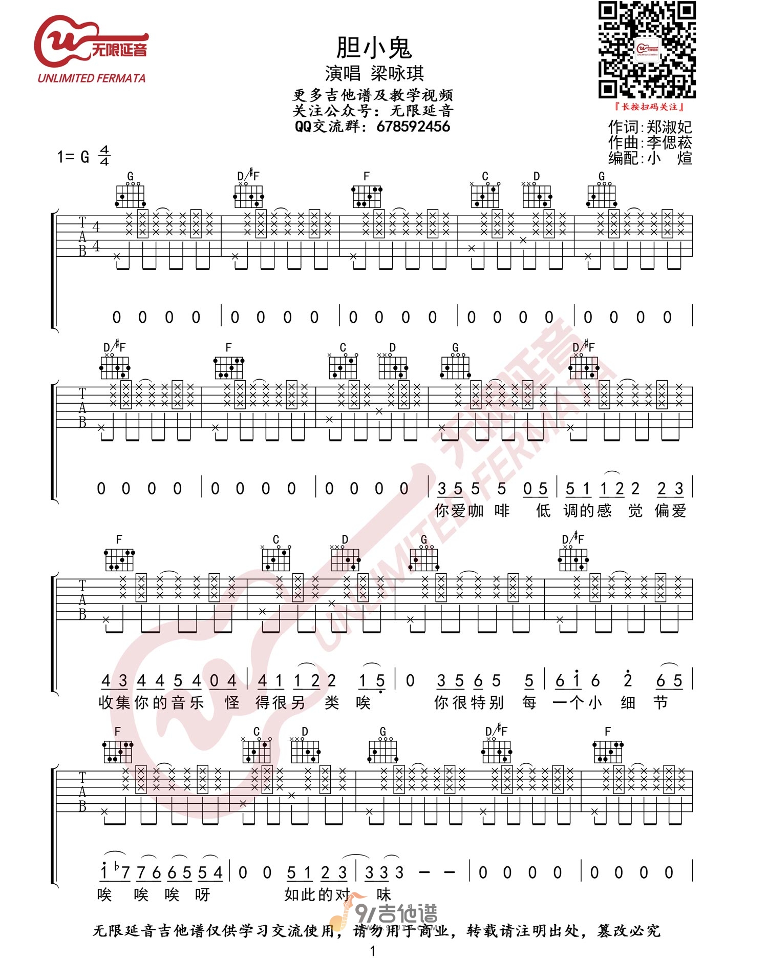 曲谱介绍: 曲谱简介:胆小鬼吉他谱,梁咏琪演唱的一首歌曲,4/4拍的节奏,这首歌曲的原调为G调,这里曲谱采用了G调指法进行编配,演唱时可不夹变调夹,曲谱由无限延音编配出品。这张生活纪事的音乐写真,轻快明亮的folk、快捷奔放的rock、抒情温馨的love,在这样的音乐里,就好似看着看着GIGI这样的在面对生活。