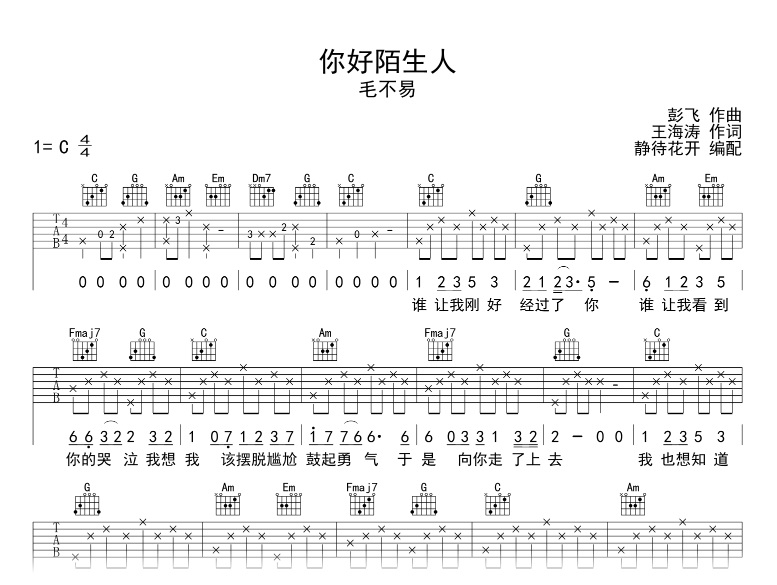 你好陌生人吉他谱 - 毛不易 - C调吉他弹唱谱