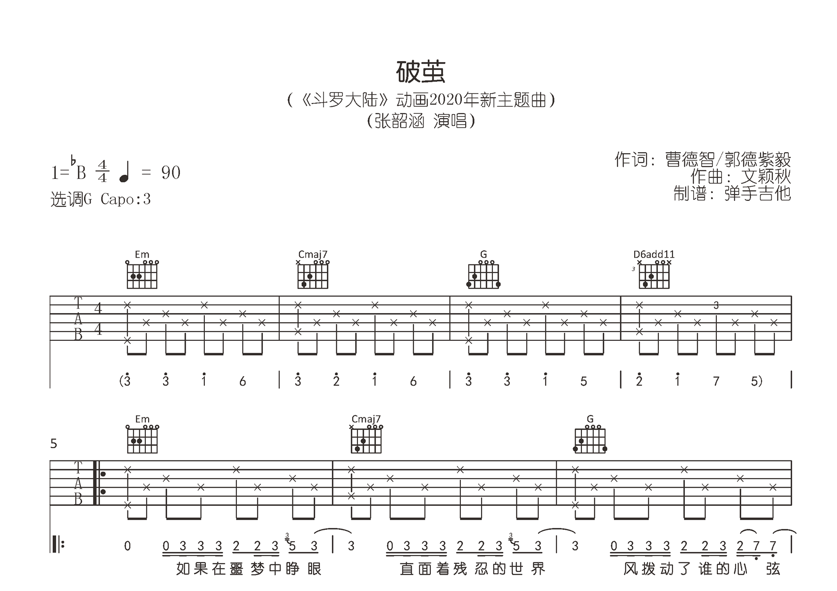 曲谱介绍: 破茧吉他谱,张韶涵演唱,动画《斗罗大陆》主题曲。《破茧》吉他弹唱谱,原调bB调,精编吉他六线谱谱选用G调和弦指法编配,Capo夹三品,完整版共两张高清图片谱。 江苏跨年晚会张韶涵一曲《破茧》引发热议,爆发的声线,唱出独特的热血与柔情,冲破阻碍,破茧成蝶!