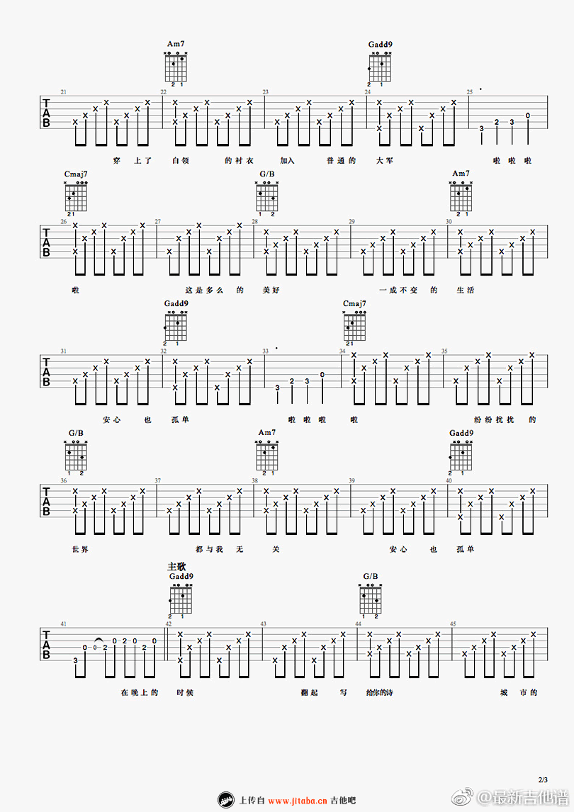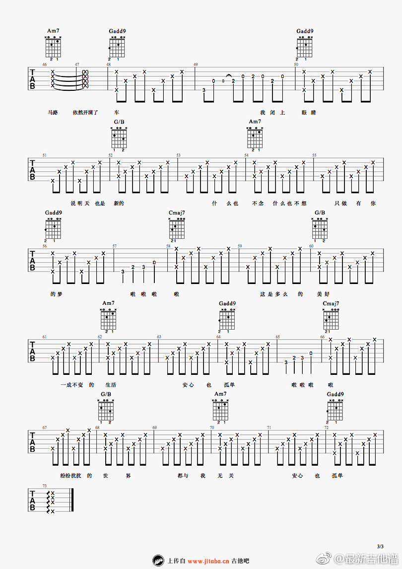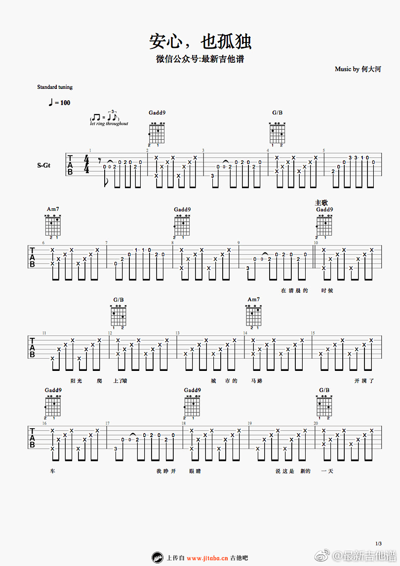 曲谱介绍: 安心也孤独吉他谱,何大河词曲原创的一首民谣歌曲,探讨都市青年人“安心,也孤独”的生活思考。 人生有一种最好的状态:享受孤独的同时,仍能自觉安心。跟随大河的音乐,以无声的方式与世界和解。 安心,也孤独吉他弹唱谱,最新吉他谱编配,TAB图片格式,三张谱例。随谱附上Guitar Pro的视频,琴友们可以参照练习。