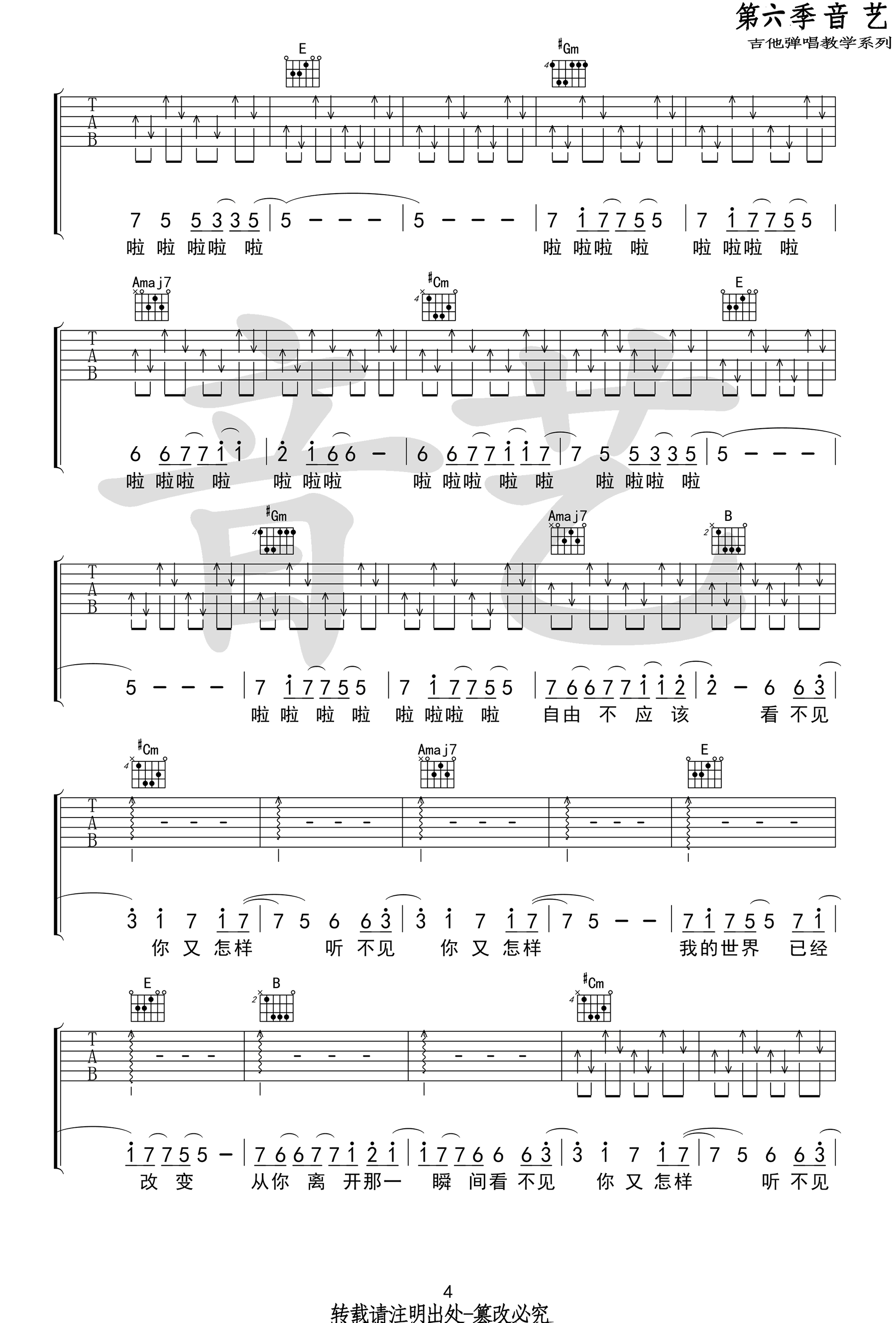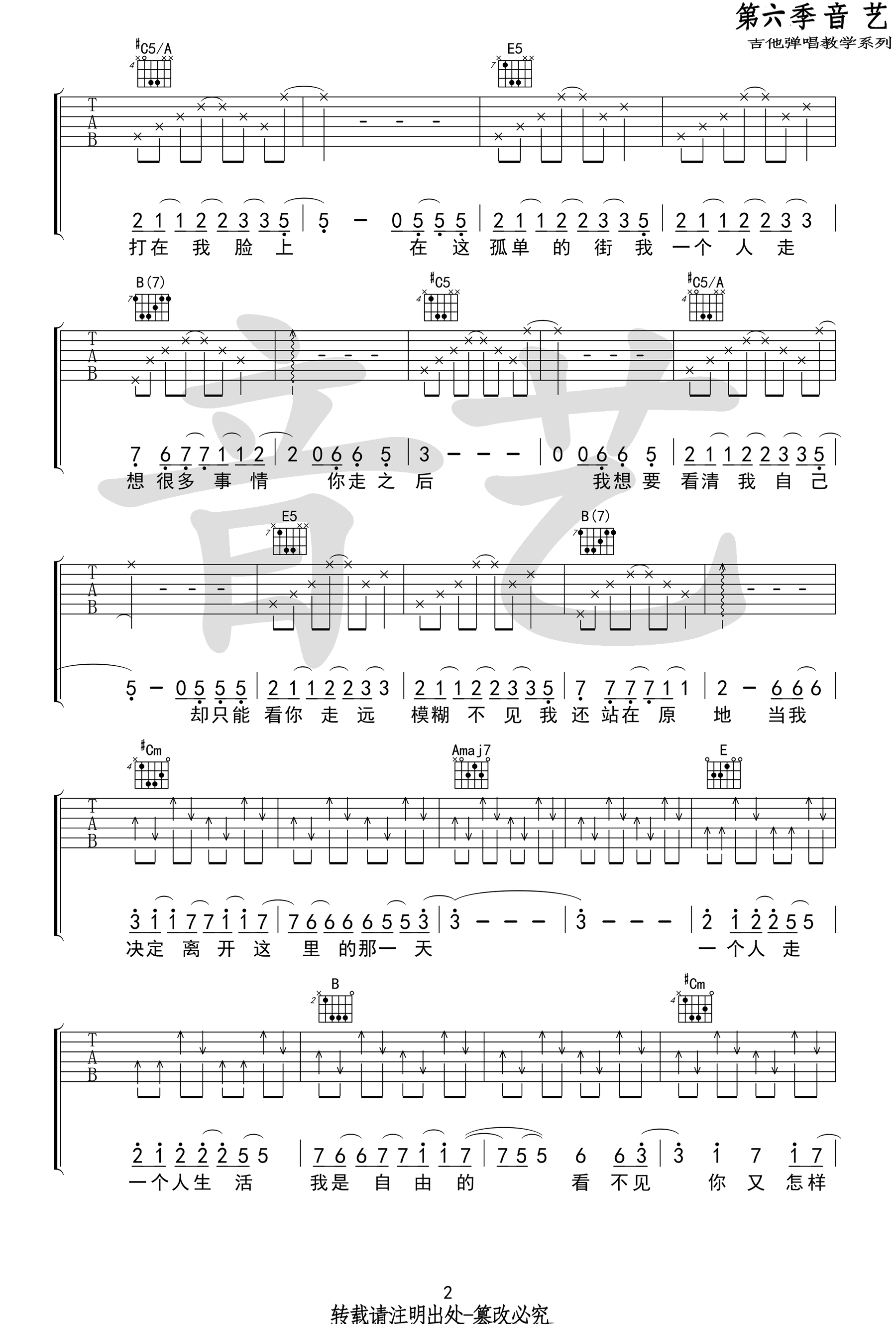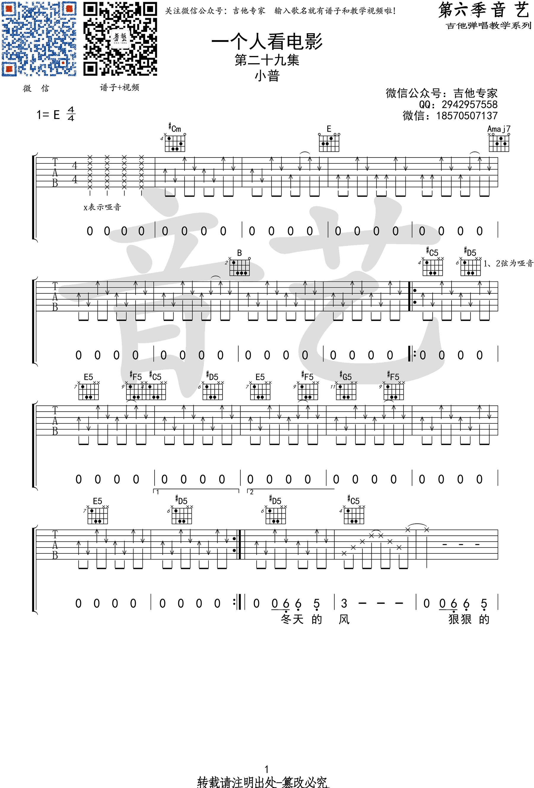 曲谱介绍: 小普《一个人看电影》吉他谱,E调指法,高清弹唱谱,一个人看电影吉他六线谱,完整版共五张图片谱子。音艺吉他编配出品,91吉他谱网站上传。 这首歌曲网上也有小熊饼干的乐队版本,阿力普小普用民谣风格表现出来另有一番味道。歌曲和声编配的很丰满,对强力五和弦的运用很到位,大量切分音和较快的速度,对各位琴友来说是一个很大的挑战。