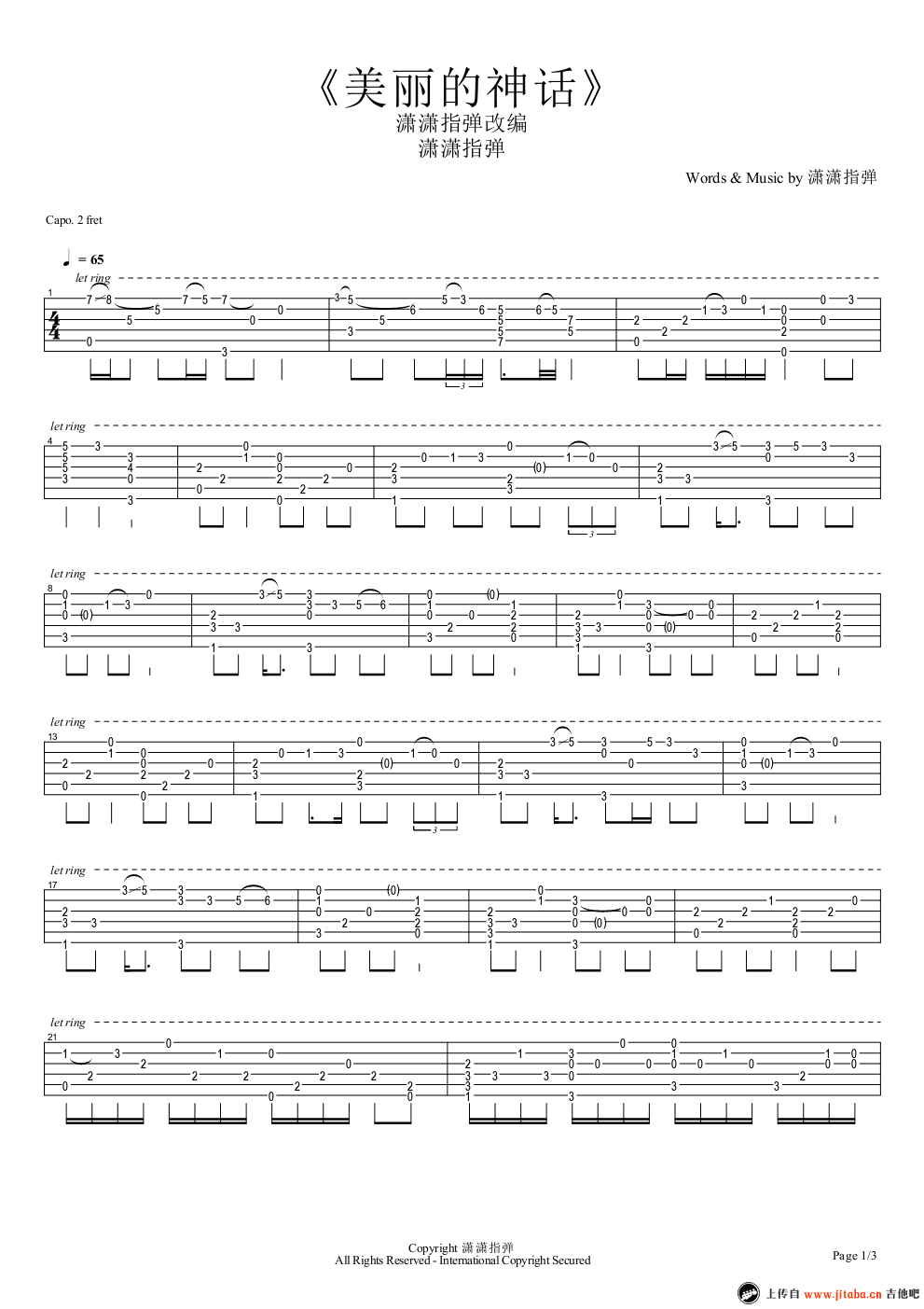 曲谱介绍: 美丽的神话吉他独奏谱,潇潇指弹吉他改编,capo夹二品。美丽的神话指弹谱,三张图片谱,成龙金喜善主演的电影《神话》主题曲,高清六线谱。感谢潇潇老师提供曲谱和指弹教学视频演示。