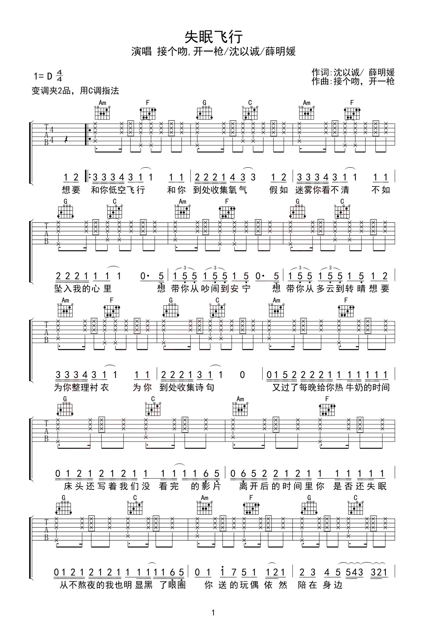 失眠飞行吉他谱 - 沈以诚/薛明媛 - C调吉他弹唱谱
