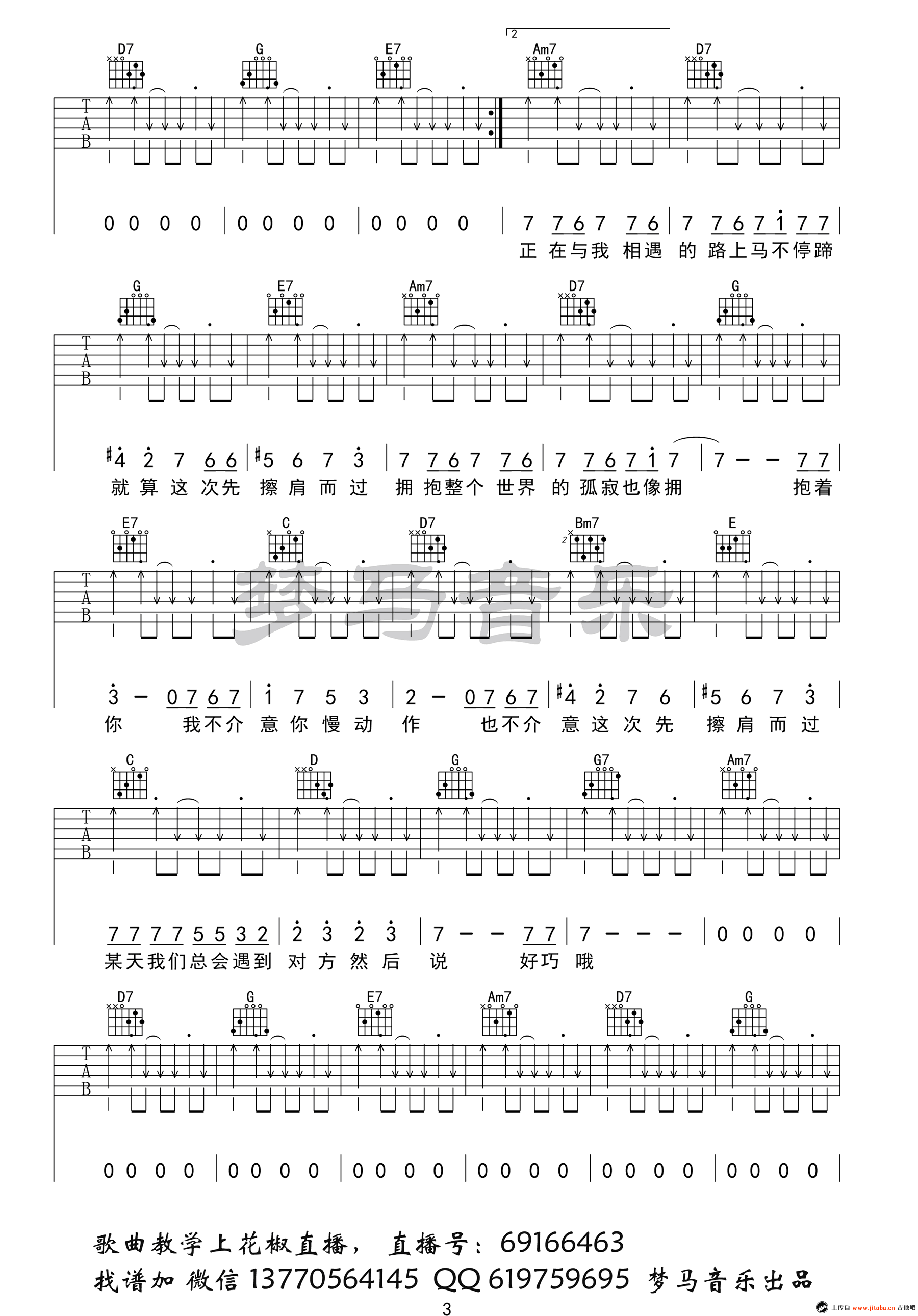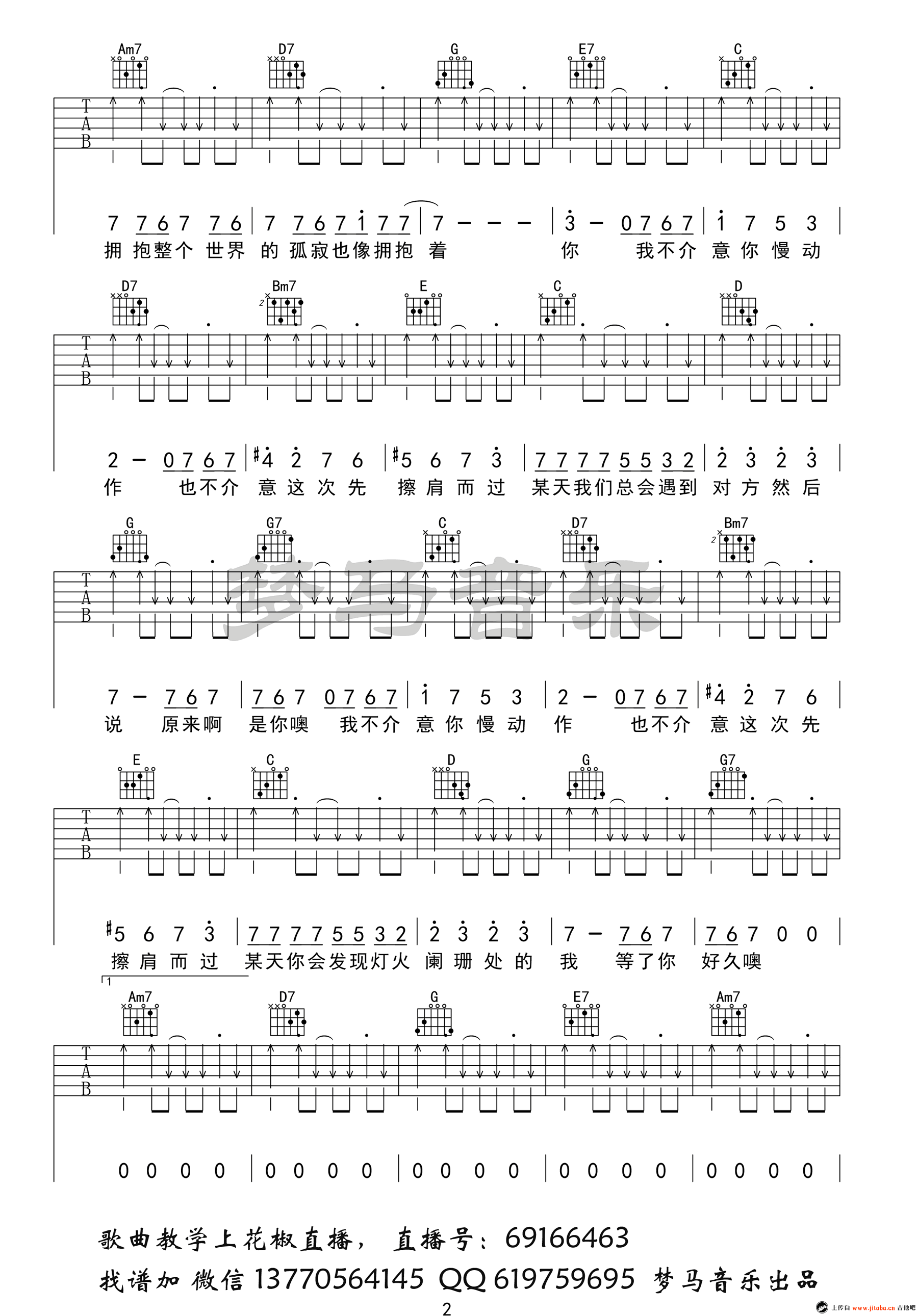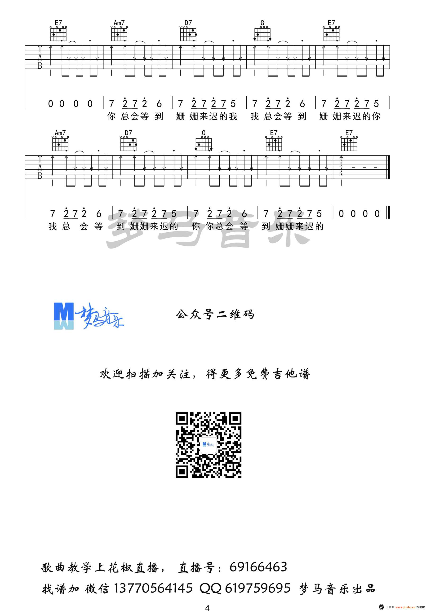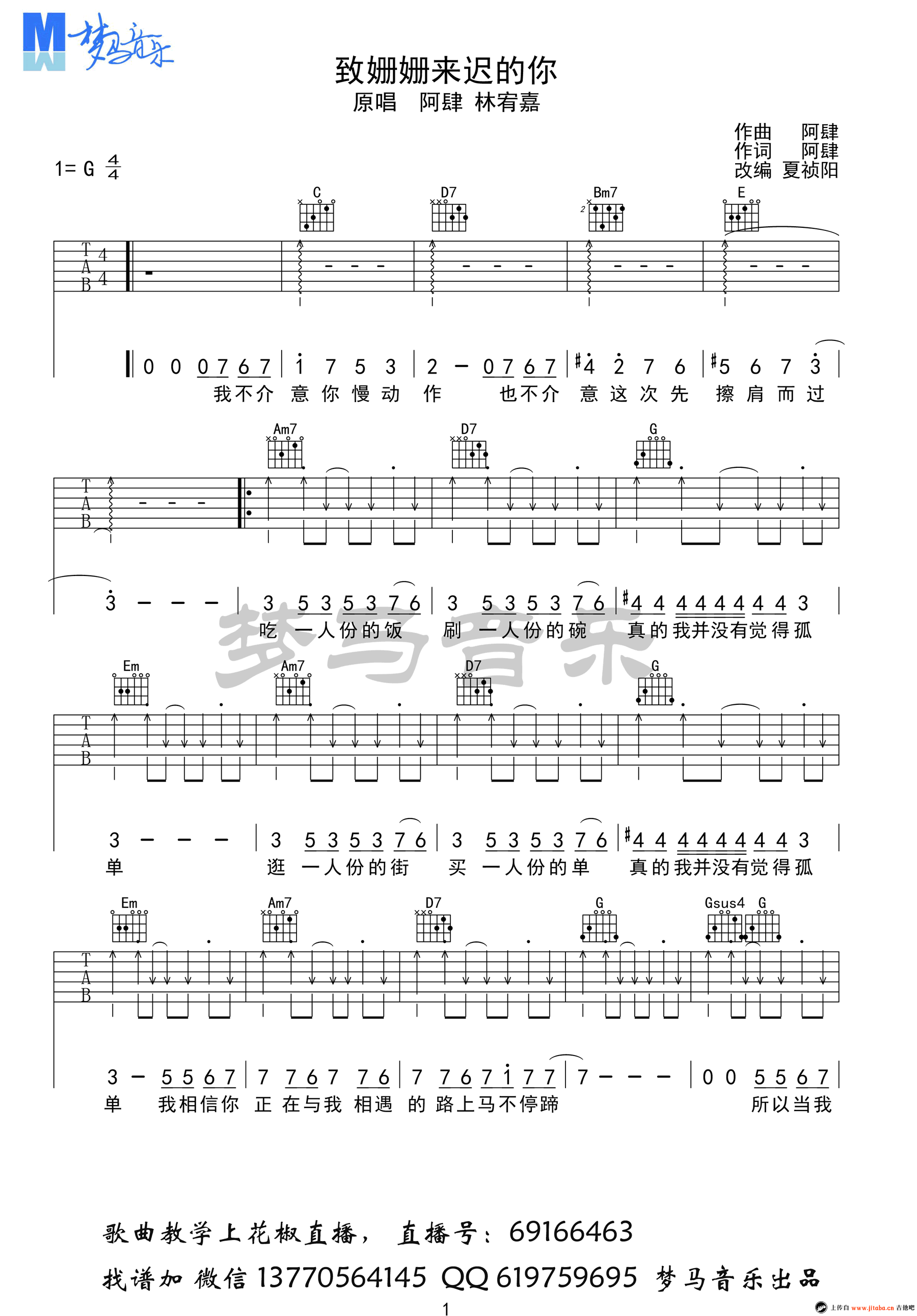 曲谱介绍: 致姗姗来迟的你吉他谱,林宥嘉阿肆男女对唱歌曲,一份好的爱情可以迟到,但一定不会缺席。致姗姗来迟的你六线谱,G调弹唱谱,高清图片谱四张谱例,感谢梦马音乐编配,91吉他谱网站推荐收藏。 暖暖的歌声让人感觉爱情里的暗恋、等待与憧憬,真是美好到让人沉醉,忍不住想要温柔起来。