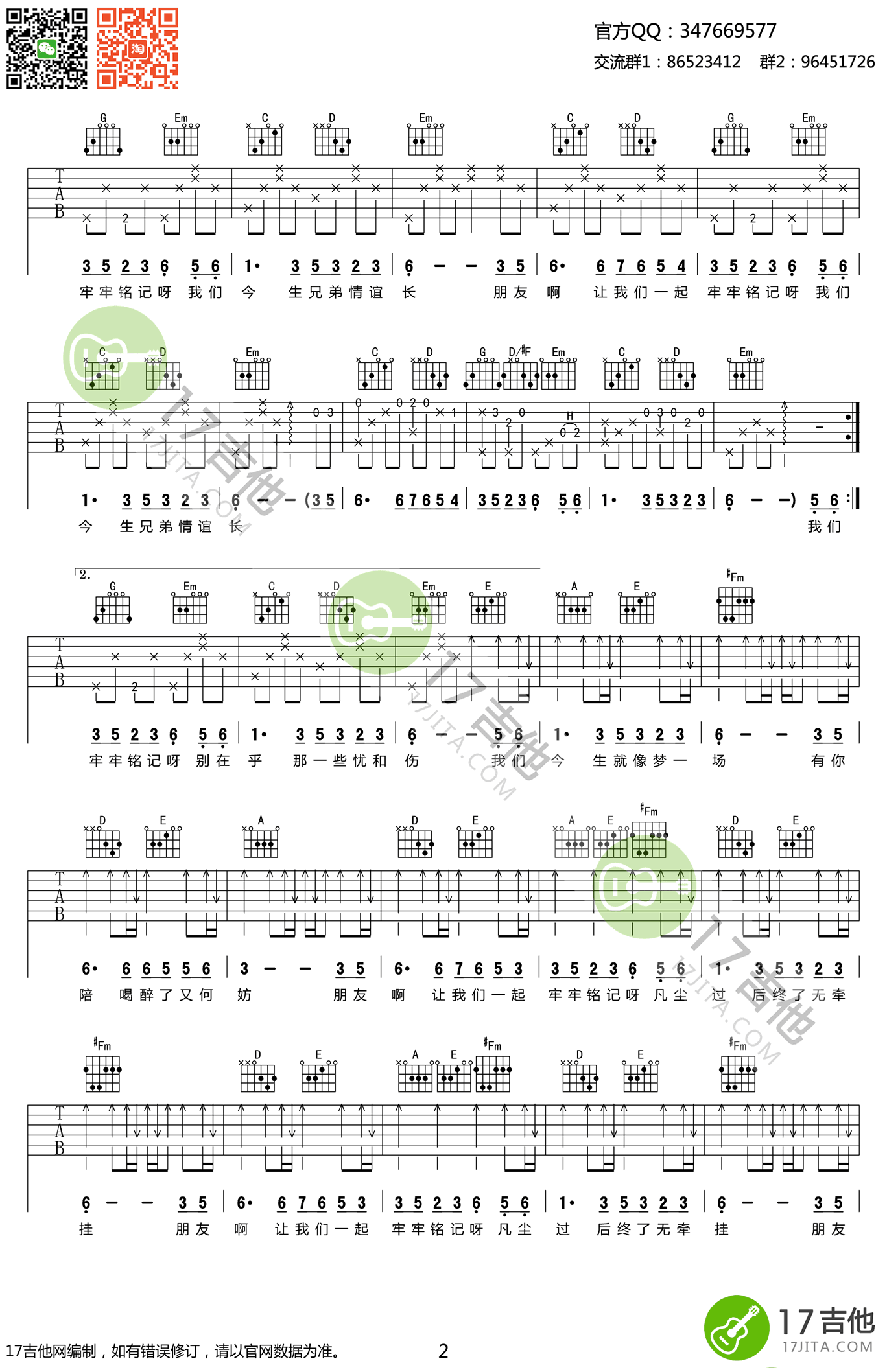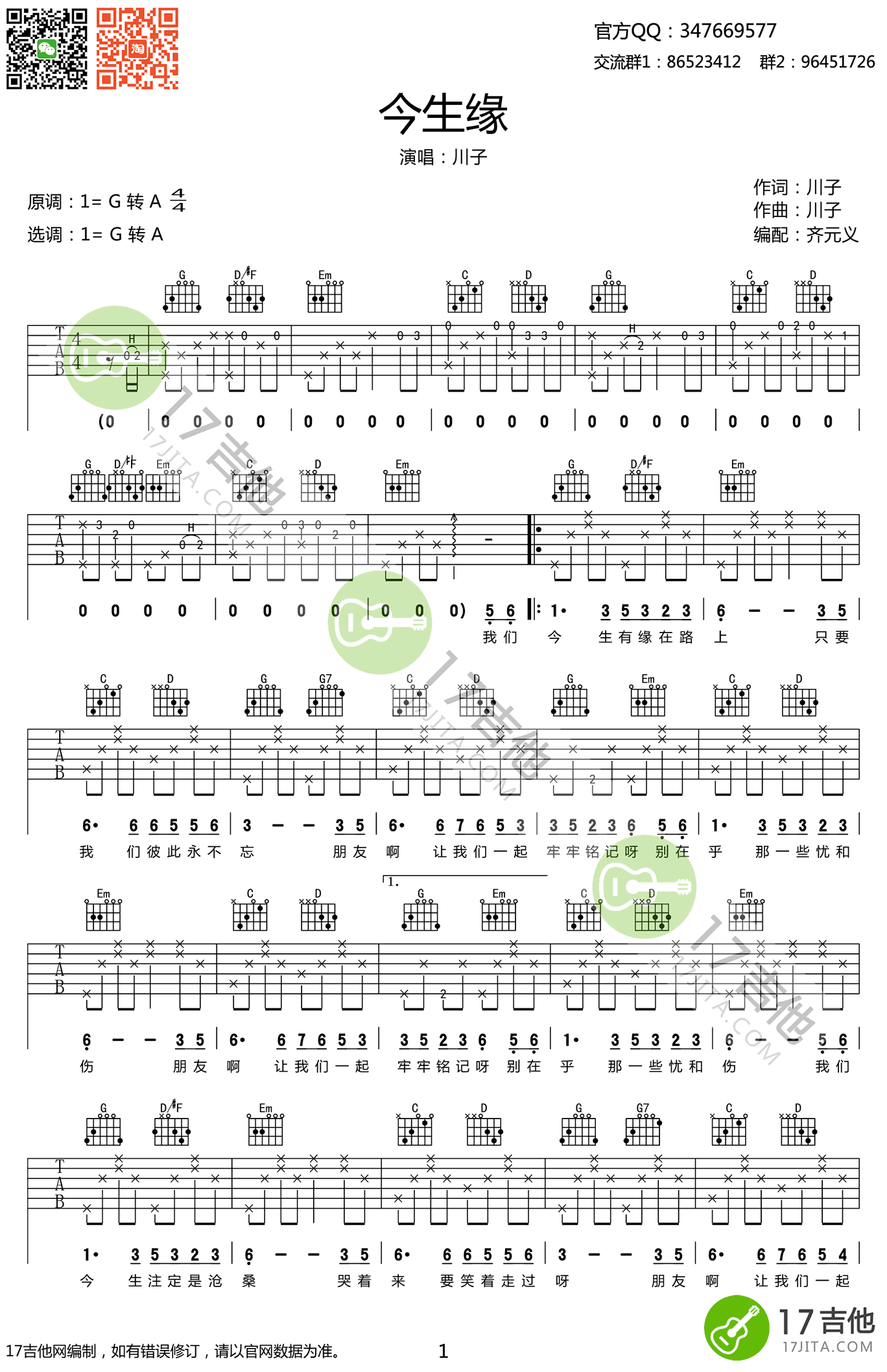 曲谱介绍: 川子《今生缘》吉他谱,G转A调弹唱谱,今生缘六线谱,高清图片谱。一个靠生活写歌的草根歌手,一首关于兄弟情义的歌曲,今生缘,琴友们如要用扫弦伴奏,请用第二段的扫弦节奏型即可。感谢齐元义编配,91吉他谱网站上传推荐。 男人的友谊,拥有同一个标签:兄弟!兄弟是一份交心的相知。这首流行于网络描述朋友情谊的抒情歌曲,在感人的歌词与旋律中,充满了对朋友情谊的怀念与珍重。曲风真挚,爆发力强,表达了牢牢铭记今生缘兄弟情的思想感情。