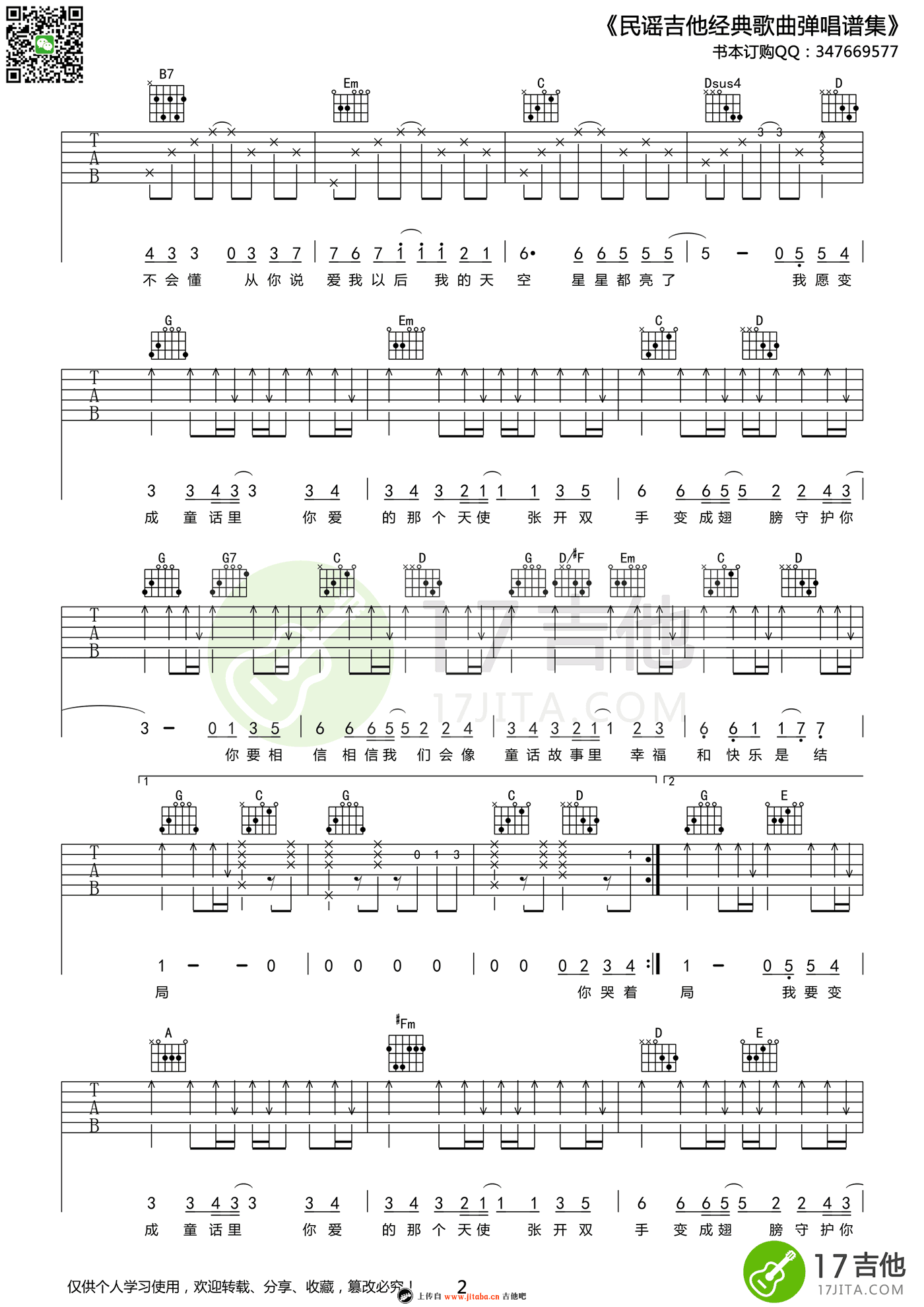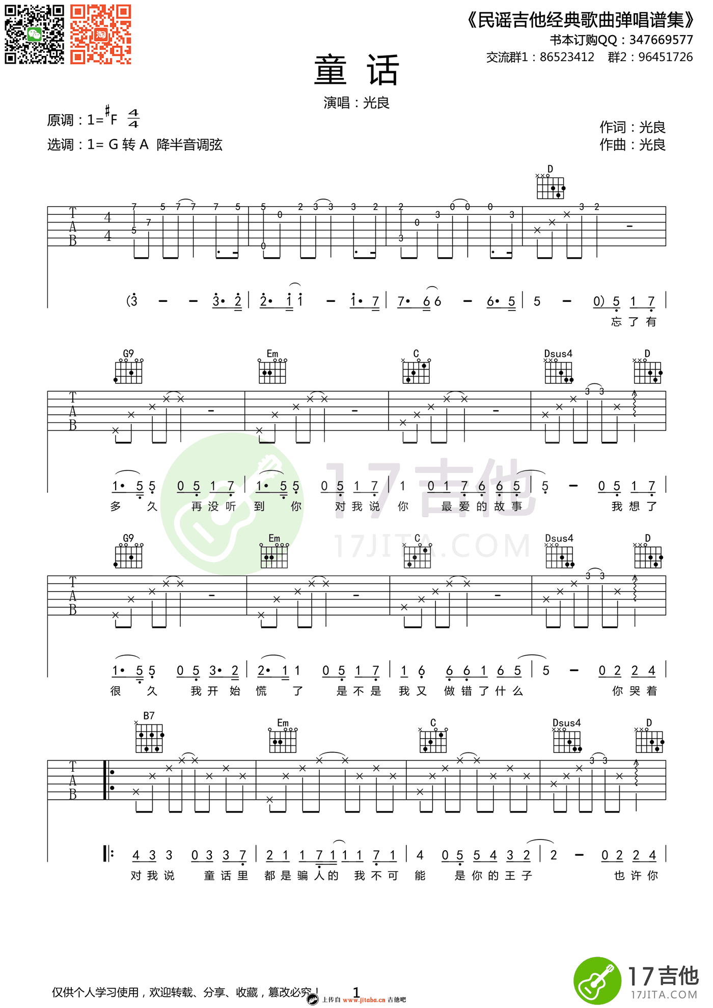 曲谱介绍: 光良《童话》吉他谱,原调#F,选调G转A,降半音调弦,童话吉他弹唱谱,高清图片原版六线谱。91吉他谱网站为琴友们上传推荐。相信自己的童话,相信梦想会成真。光良 的《童话》为所有人们带来一些继续相信下去的力量。 一首经典的老歌,悠扬婉转的旋律唤起我们心底多少美好的回忆。每个人的生活里都有一个童话,现在那个陪你听童话的人还在你身边吗?