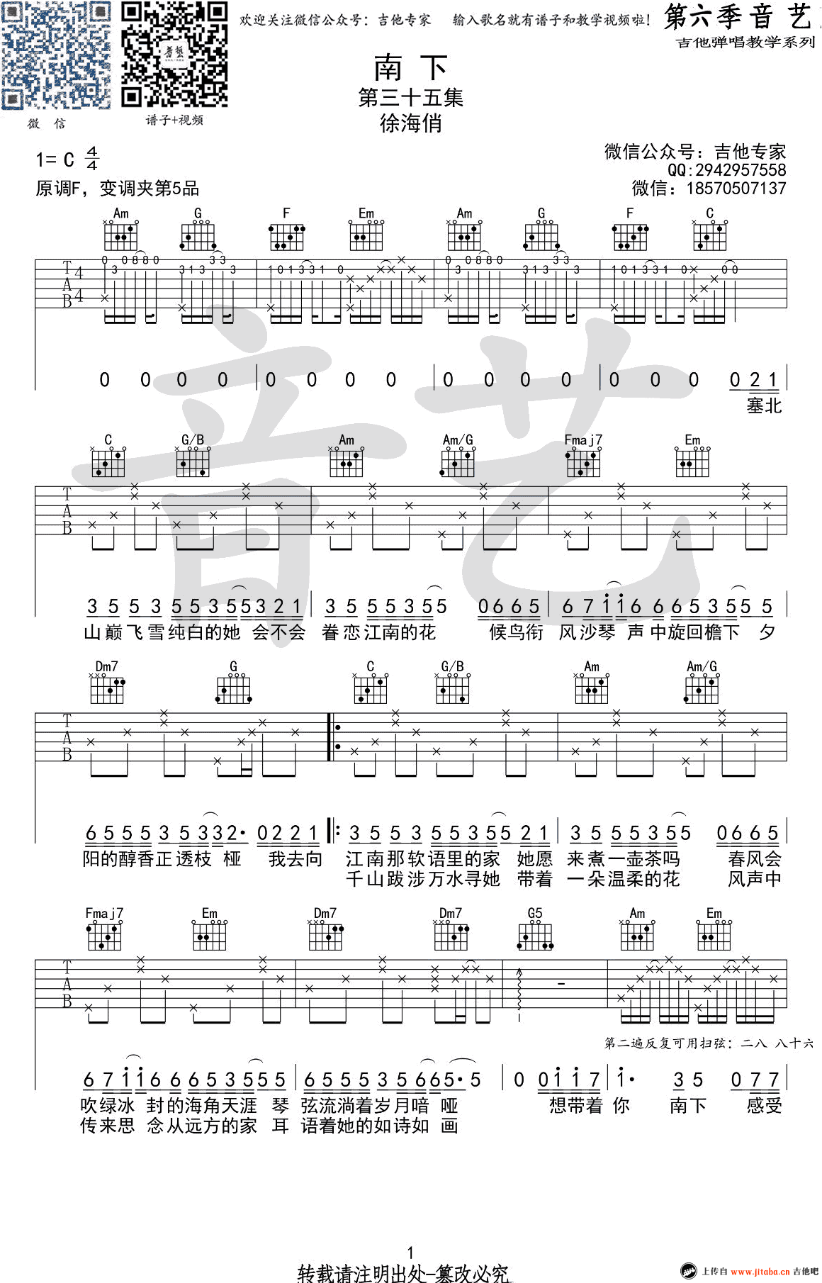 曲谱介绍: 徐海俏《南下》吉他谱,原调F,选用C调指法,变调夹夹五品。南下六线谱,高清弹唱谱,两张图片谱例。感谢音艺吉他编配,91吉他谱为大家上传推荐。 歌曲由一种慵懒的味道,来自北方姑娘对南方的理解和向往。曲谱编配的时候改了一些细节和声,大体和原版一样,为了让大多数琴友都可以弹奏,特意用的C调指法编配,这样成功避开了两个大横按。