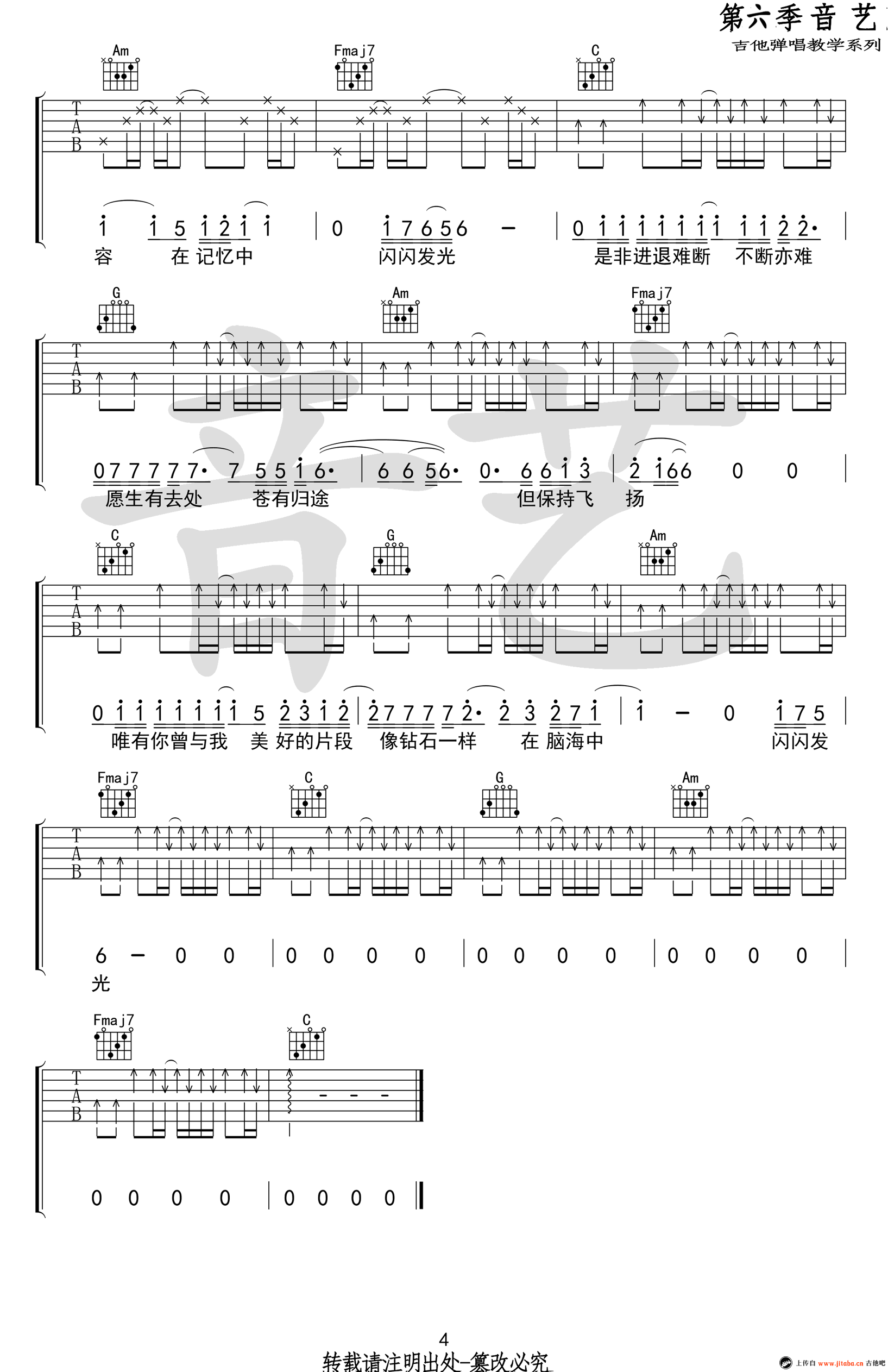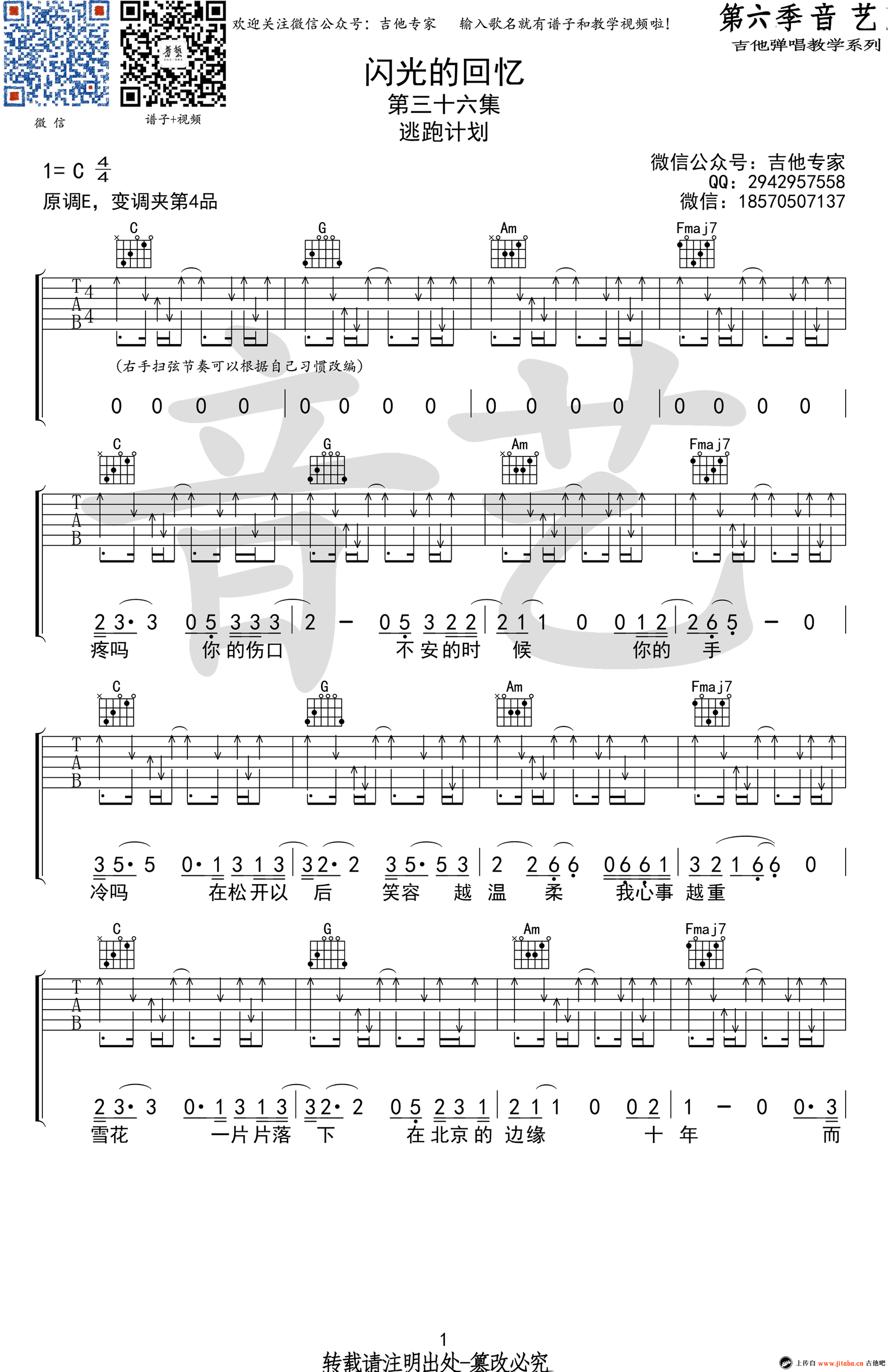 曲谱介绍: 逃跑计划《闪光的回忆》吉他谱,原调E,变调夹夹四品,选用C调指法编配,闪光的回忆六线谱,高清弹唱图片谱,音艺吉他出品,91吉他谱网站收藏推荐。感谢摇滚猫老师编配,这首歌曲和声很简单1 5  6  4,原曲右手的节奏型比较随意,琴友们在弹琴的时,可根据自己的习惯来弹奏,不用拘泥于谱子。