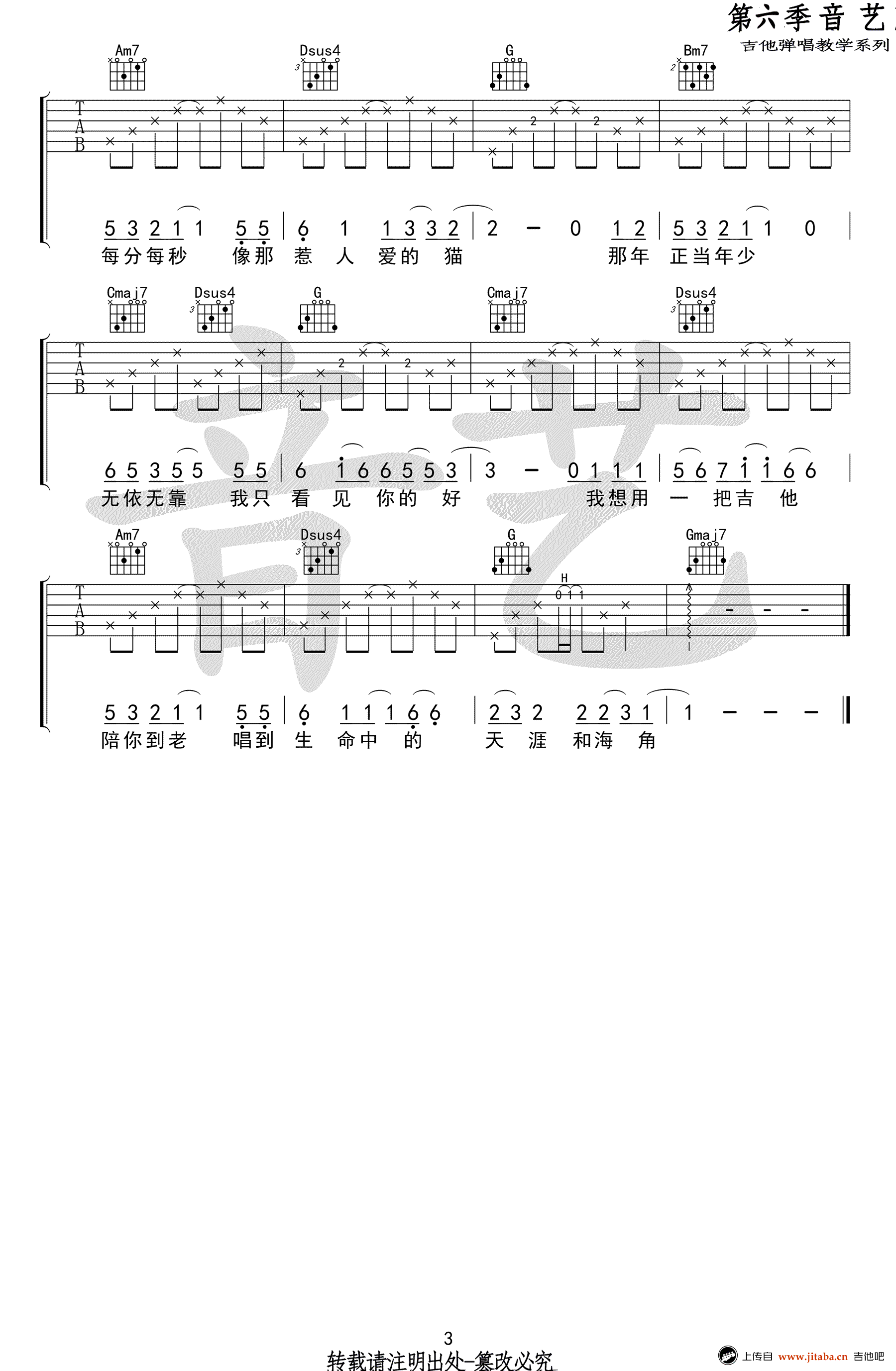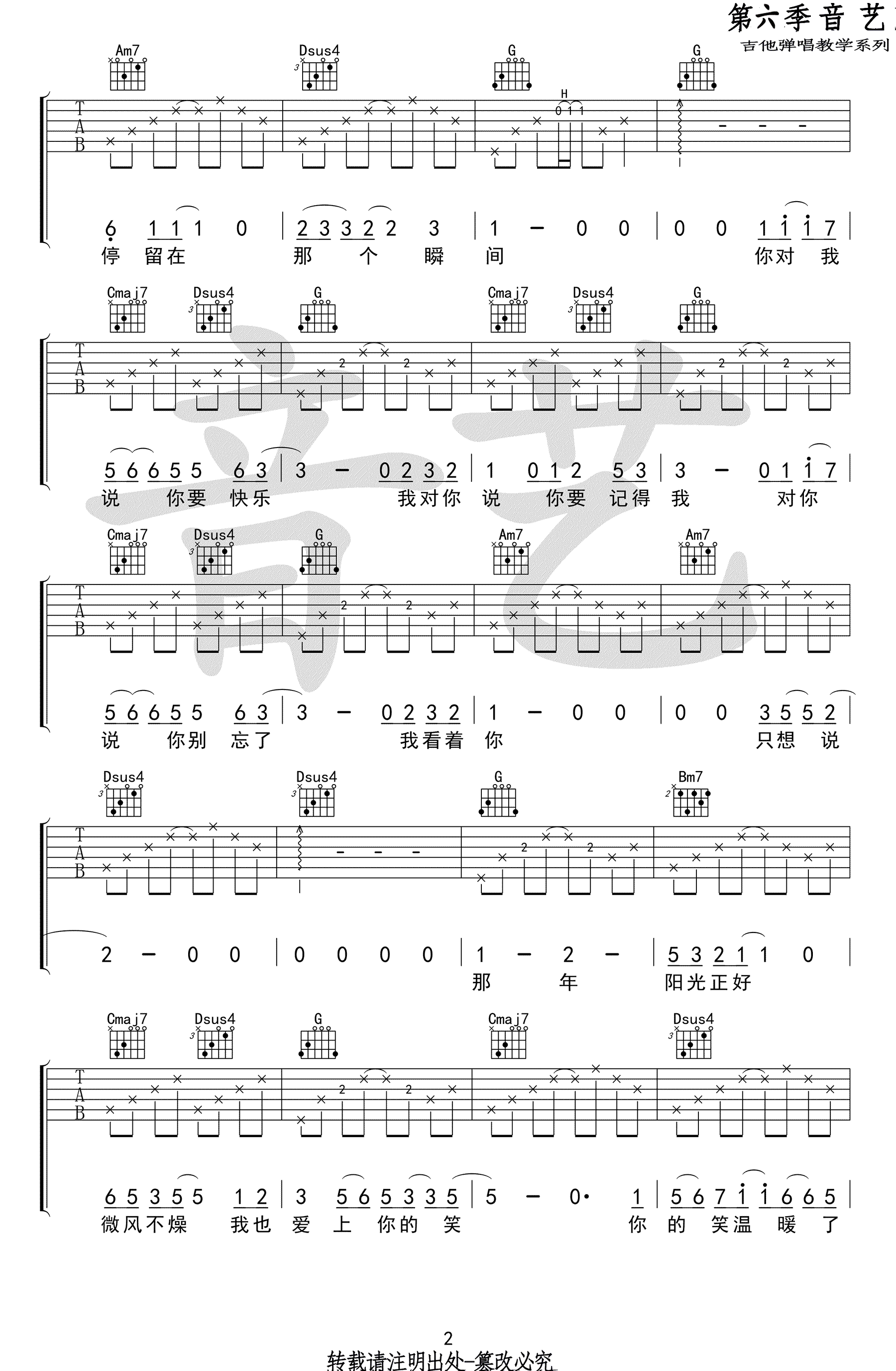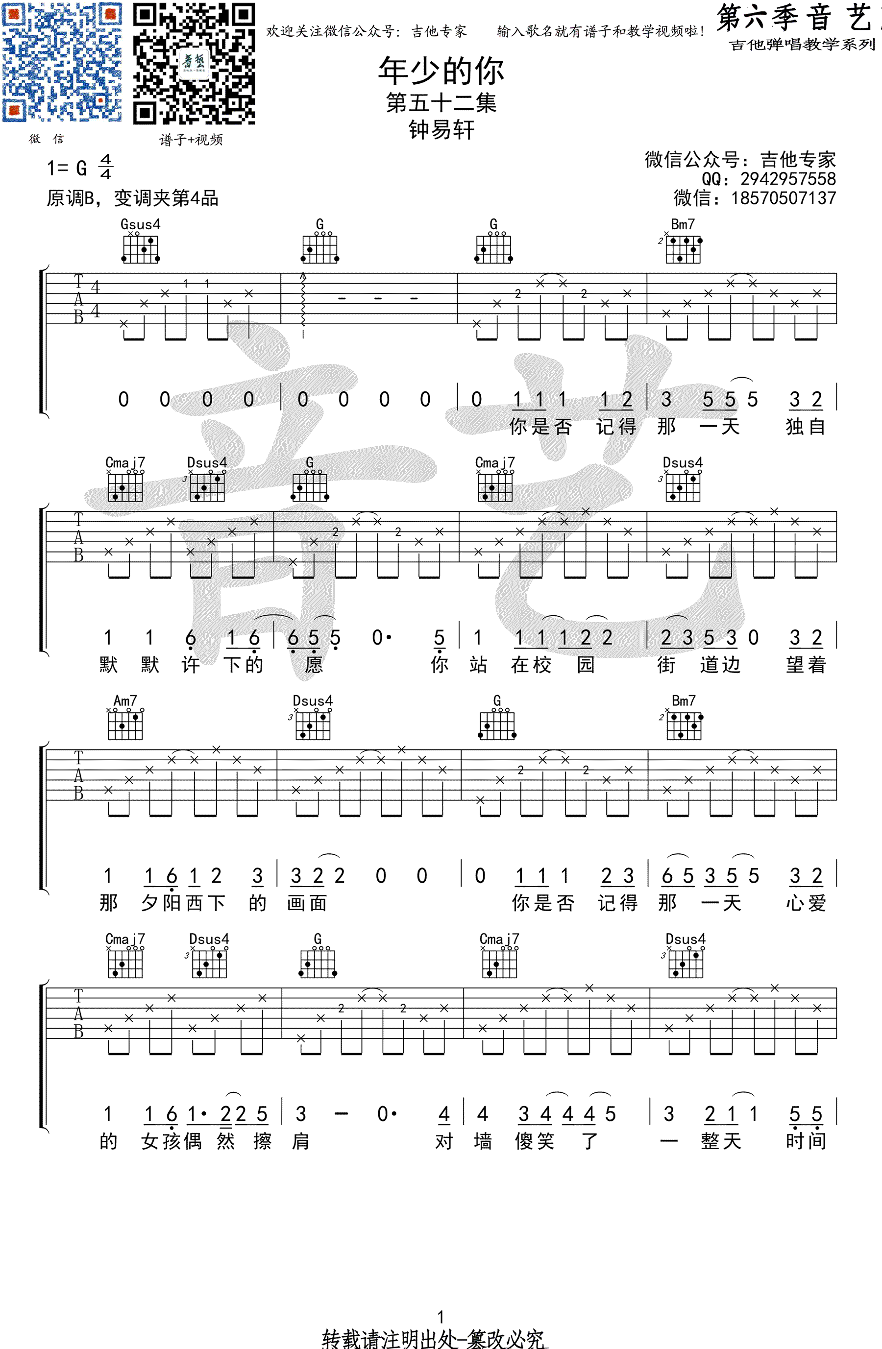 曲谱介绍: 年少的你吉他谱,钟易轩演唱,明日之子优秀歌曲,年少的你吉他弹唱谱,G调指法,CAPO夹四品。高清图片谱共三张。音艺吉他编配出品,91吉他谱上传分享。 一首格外纯粹干净动人的歌曲,低吟浅唱,细细品尝,仿佛回到那年阳光正好的青春岁月!摇滚猫老师:很多人都向我推了《年少的你》,因为歌曲本身不难,所以我也就没有再做一份简易版的了,为了满足节目的需求歌曲只有不到2分钟,大家在弹唱的时候如果嫌时间短可以多反复一遍!