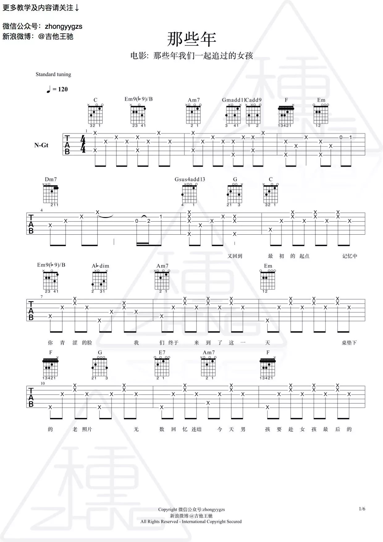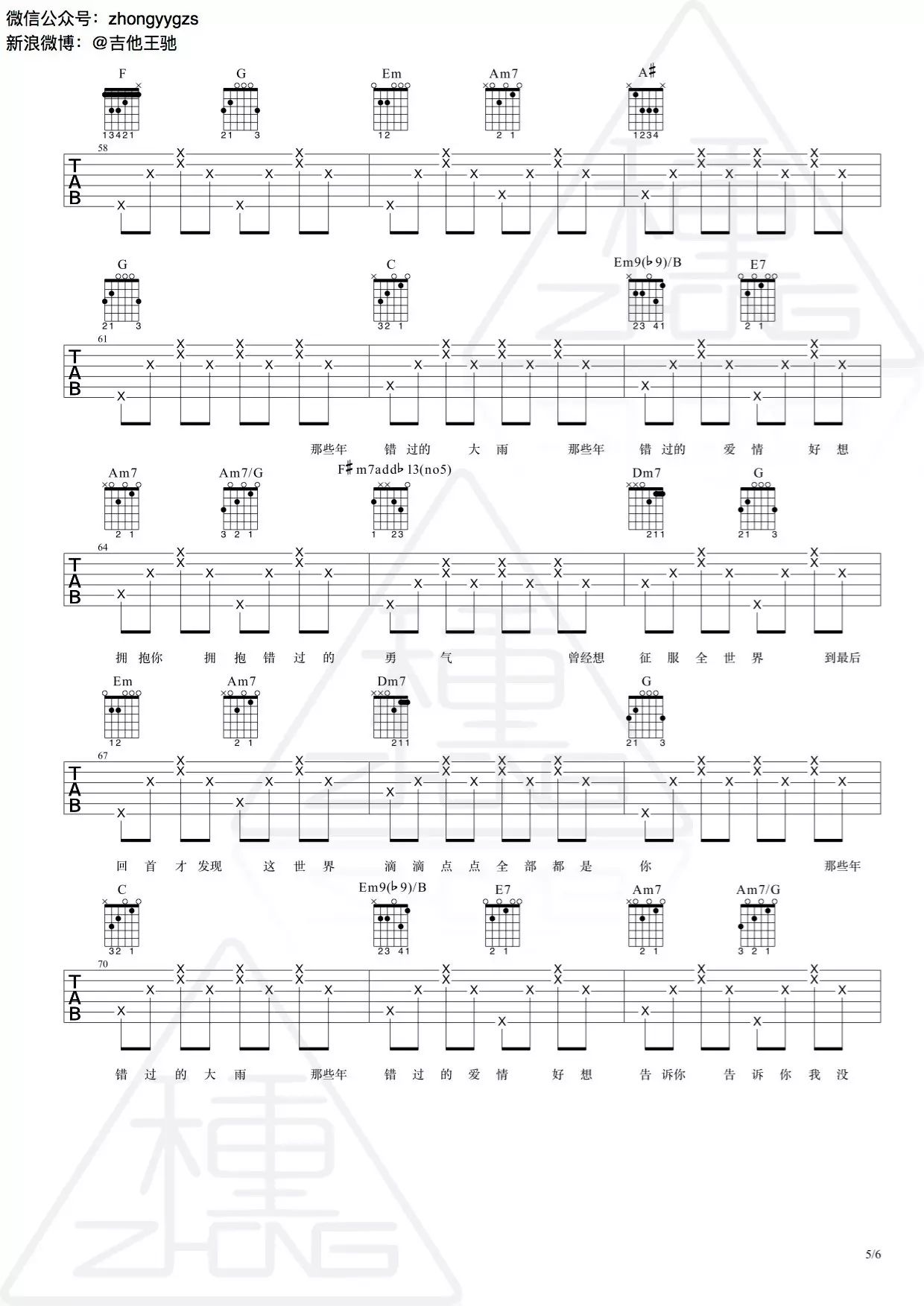 曲谱介绍: 那些年吉他谱,胡夏演唱,电影《那些年我们一起追过的女孩》主题曲,那些年六线谱,完整版共六张图片谱。感谢王驰编配,并提供吉他弹唱演示视频,91吉他谱网站推荐收藏。青春是一场酣畅淋漓的大雨,错过了就是永远 。非常经典的一首青春电影主题曲,带我们一起回忆曾经的青葱岁月。