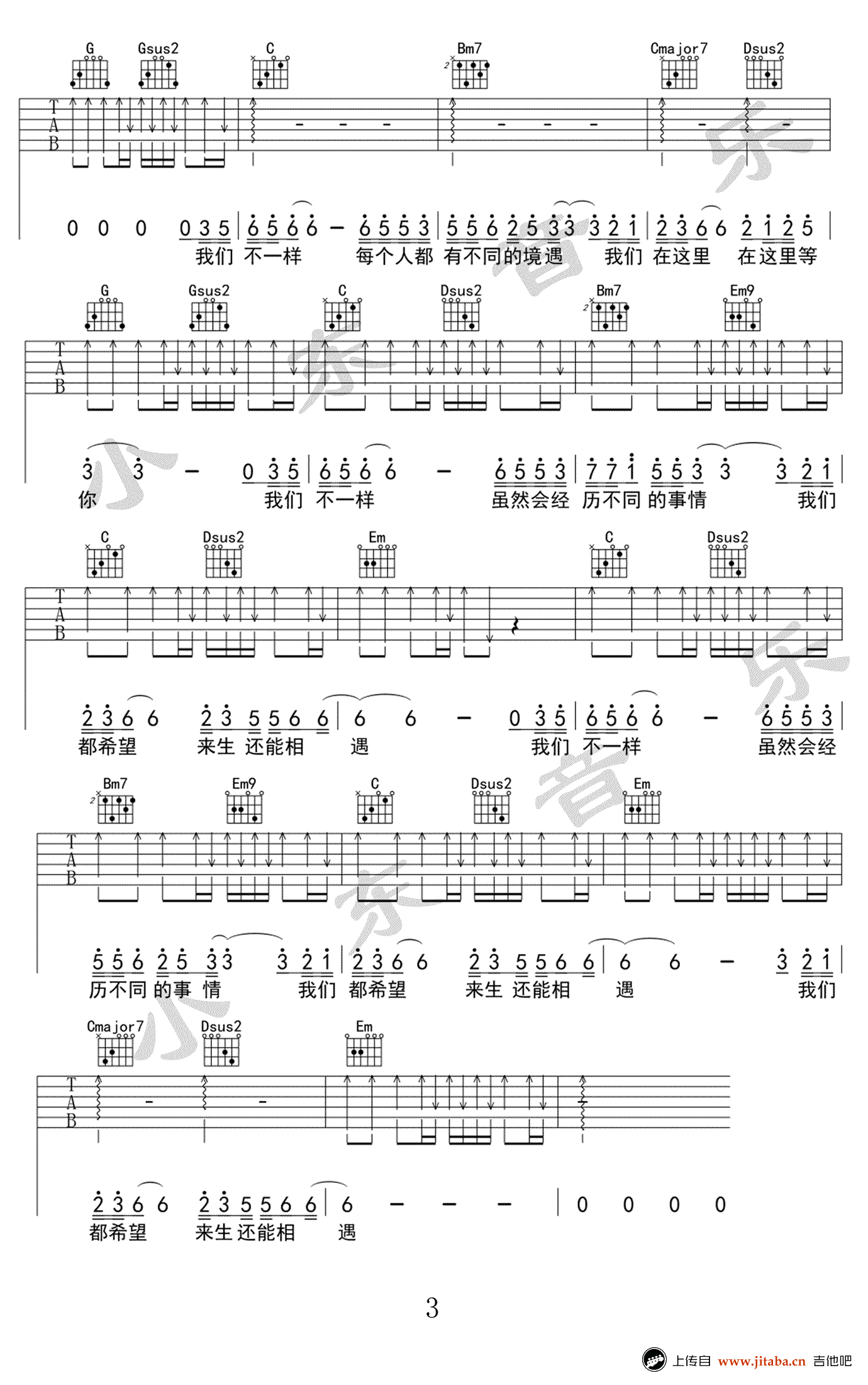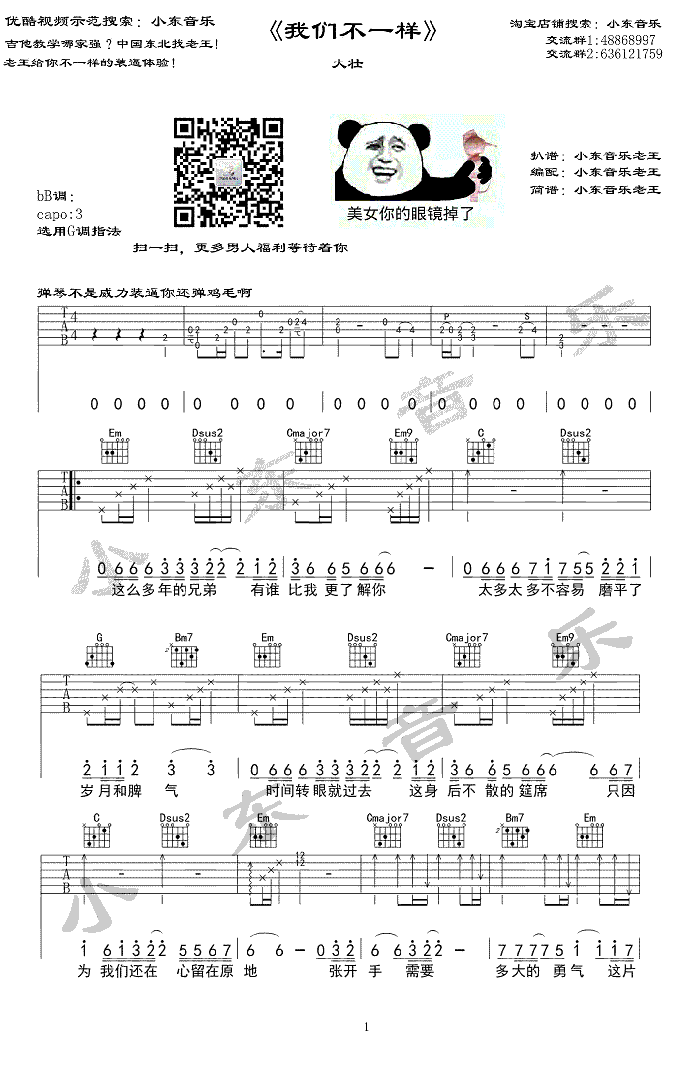 曲谱介绍: 大壮《我们不一样》吉他谱,原调降B,变调夹夹第3品,选用G调指法,一首好听的网络红歌,我们不一样弹唱六线谱,三张图片谱。小东音乐编配出品,91吉他谱网站上传收藏。 高进老师用充满了人生经历的文笔,一词一句的勾勒出了那份浓浓的兄弟之情,人到了一定的年龄,身上的棱角会慢慢的变少,变得圆滑,学会了变通、取舍!然而始终相互鼓励真挚相待的是身边的兄弟朋友,珍惜眼前人,珍惜这份情!我们都希望来生还能相遇!