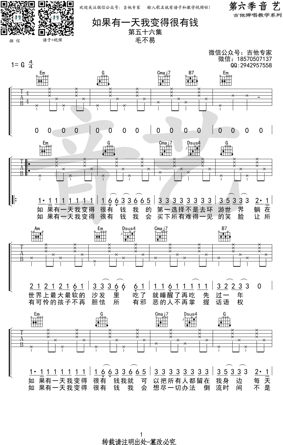 如果有一天我变得很有钱吉他谱 - 毛不易 - G调吉他弹唱谱
