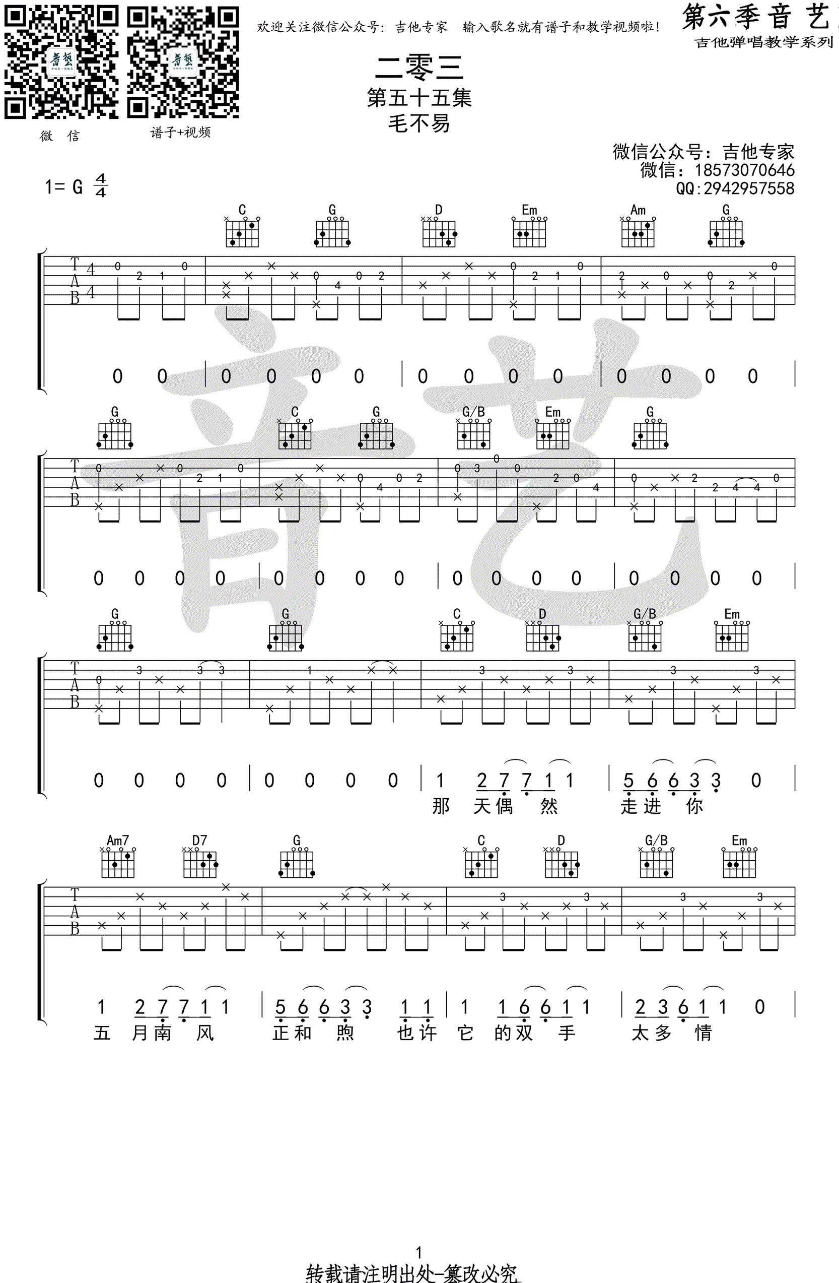 曲谱介绍: 毛不易《二零三》吉他谱,203G调原版吉他谱。二零三吉他弹唱谱,高清图片六线谱。明日之子大放异彩的音乐创作歌手毛不易的一首新歌,感谢音艺吉他编配出品,91吉他谱网站整理上传。 一首关于漂泊游子心声的原创歌曲,203唱出了在外租房打拼的人们内心的渴望和柔情,那种大都市喧嚣背后的那一份小角落的寂寞,触动每一个人的内心。。