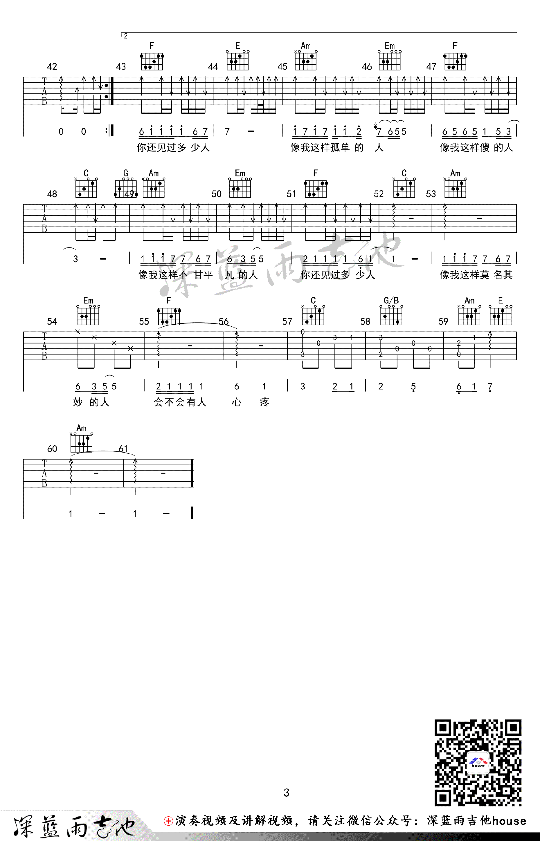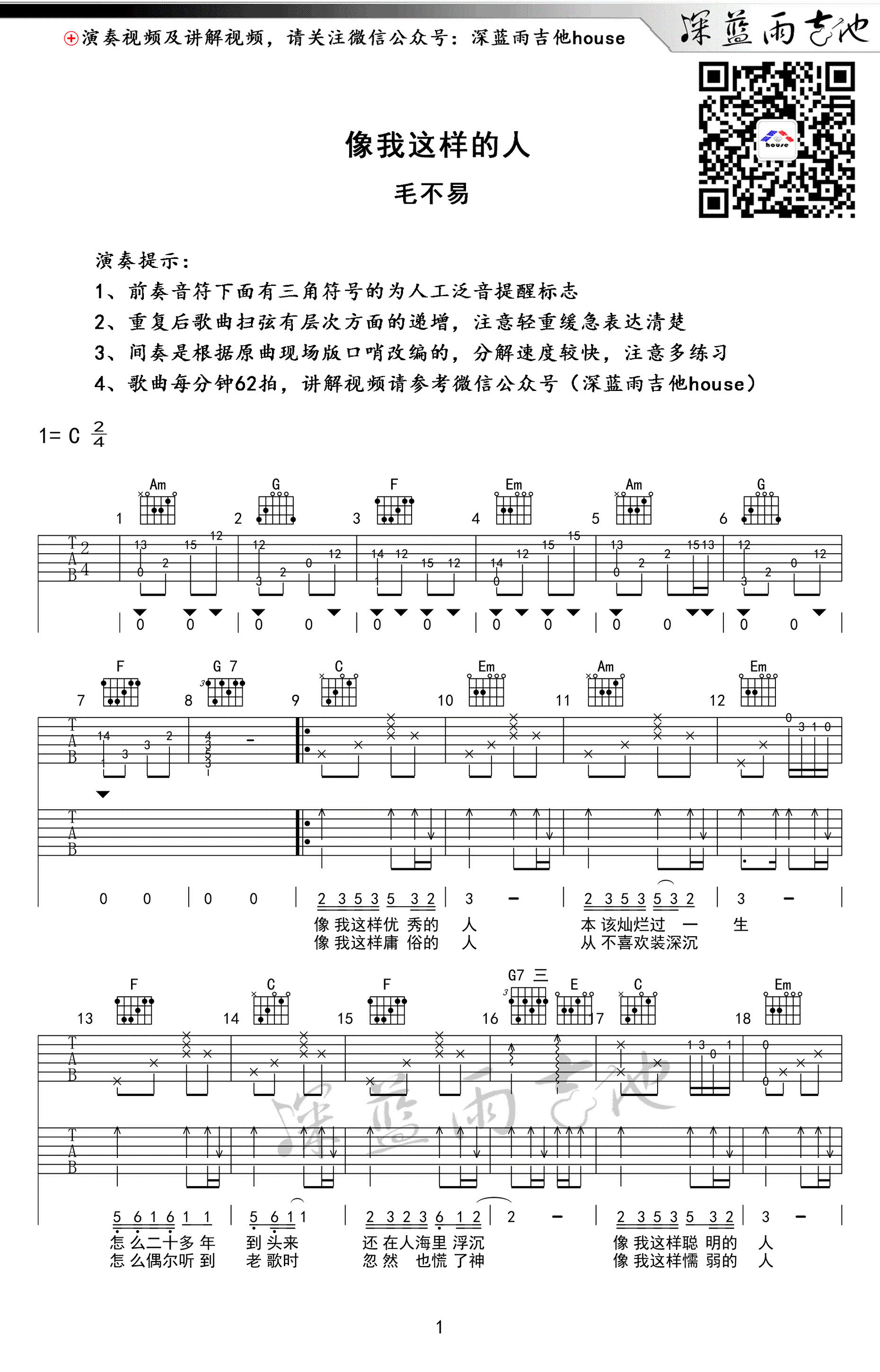 曲谱介绍: 像我这样的人吉他谱。C调指法,毛不易《像我这样的人》六线谱,高清弹唱图片谱。感谢深蓝雨吉他编配。演奏提示:注意前奏音符下面有三角符号是人工泛音提醒标志,重复后歌曲扫弦有层次方面的递增,注意轻重缓急表达清楚。节奏是根据原曲现场版口哨改编的,分解速度较快,琴友们多加练习。