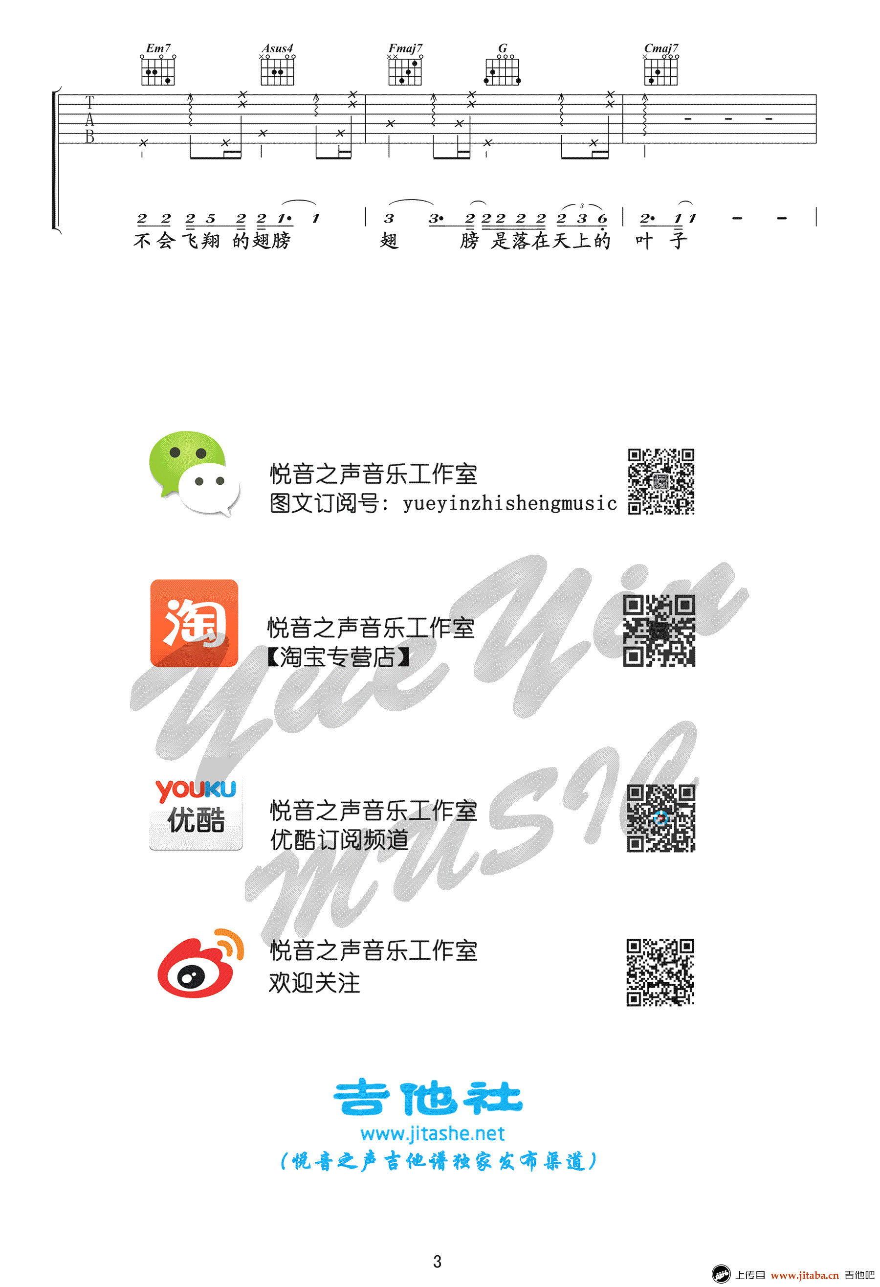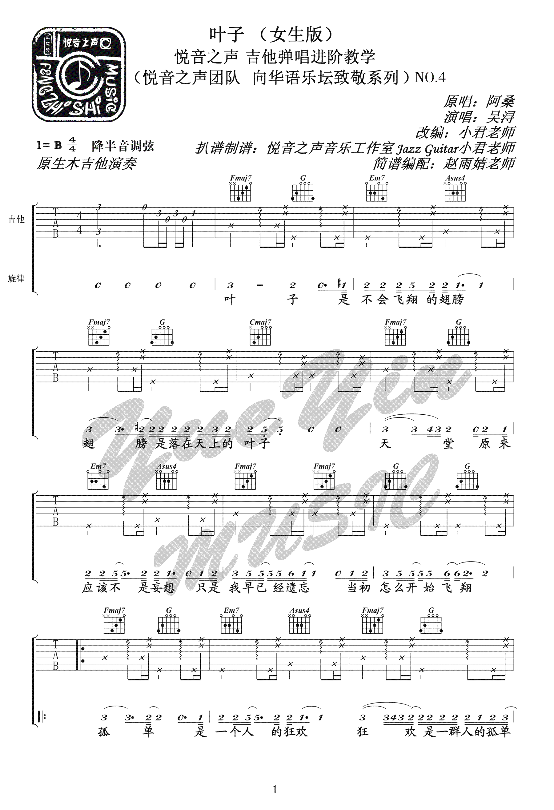 曲谱介绍: 阿桑《叶子》吉他谱,一首金曲老歌吉他弹唱,叶子六线谱,三张高清图片谱,女生版弹唱谱,歌曲原调B,为方便和弦木吉他演奏采用了降半音调弦编配,感谢悦音之声出品,琴友们可以根据老师的教学讲解练习,91吉他谱网站上传推荐。 唱《叶子》的阿桑离开了我们,但一个人吃饭旅行到处走走停停的你或者我还有很多很多。生命无常,说起来似乎太沉重,不过正因为这无常,每一个清晨醒来,都要好好感谢这新的天光,好好对待自己,哪怕只有一个人。 一首​华语乐坛经典作品,送给大家。