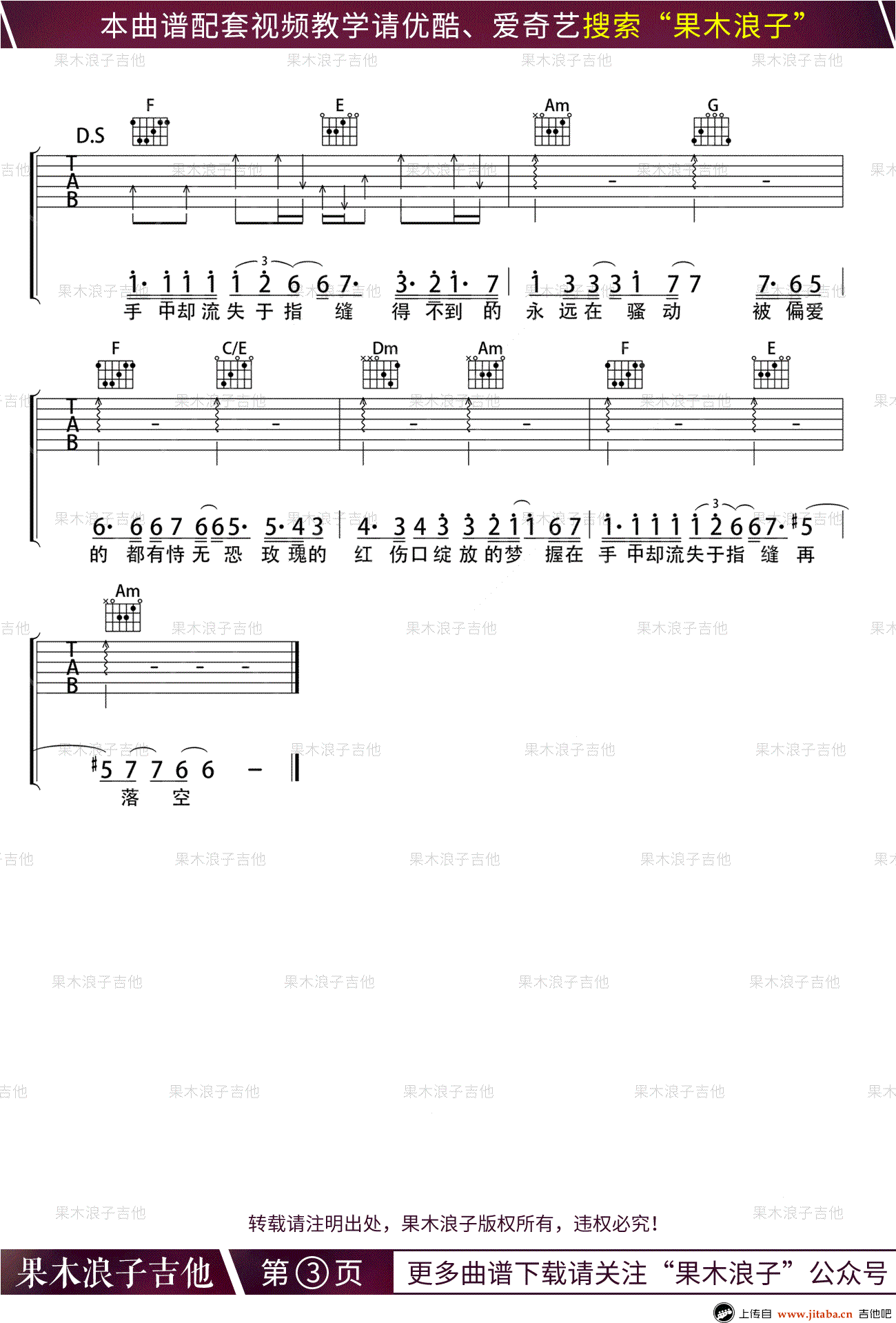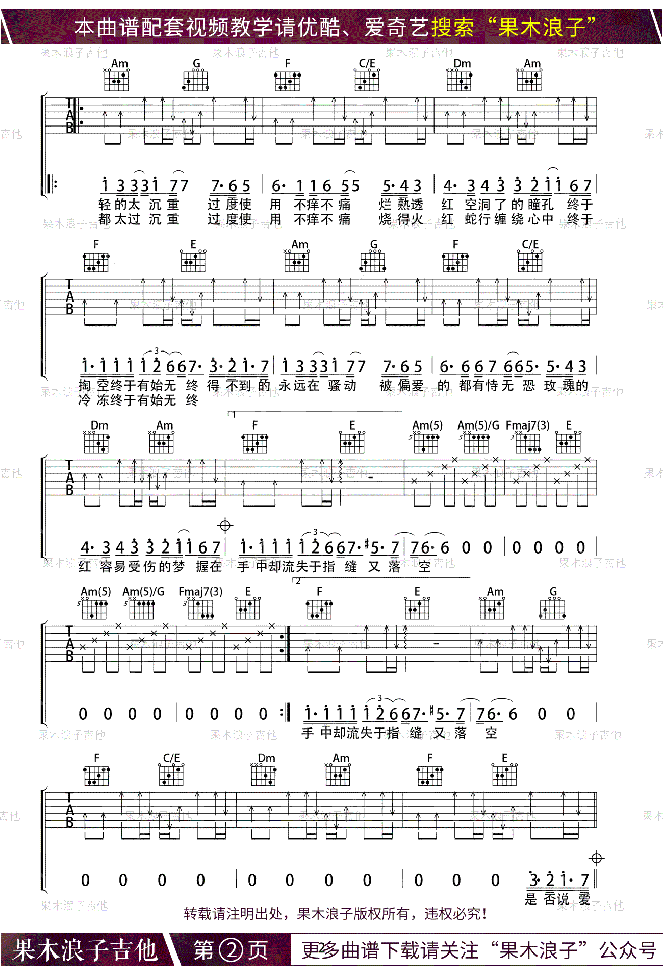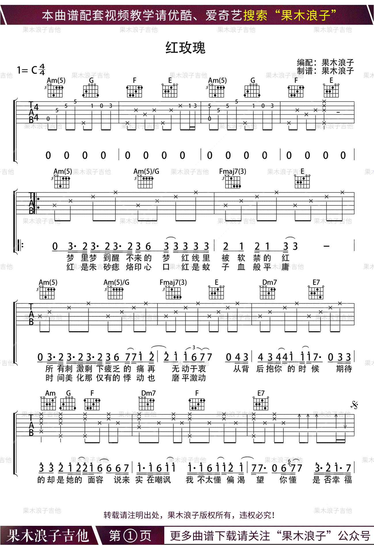 曲谱介绍: 陈奕迅《红玫瑰》吉他谱,C调高清弹唱谱,陈奕迅红玫瑰六线谱,果木浪子编配,男生不需要变调夹,女生可以使用变调夹夹五品。这首歌曲主歌副歌没有太大的难度,前奏的几个需要注意的点琴友们参考老师的视频讲解。