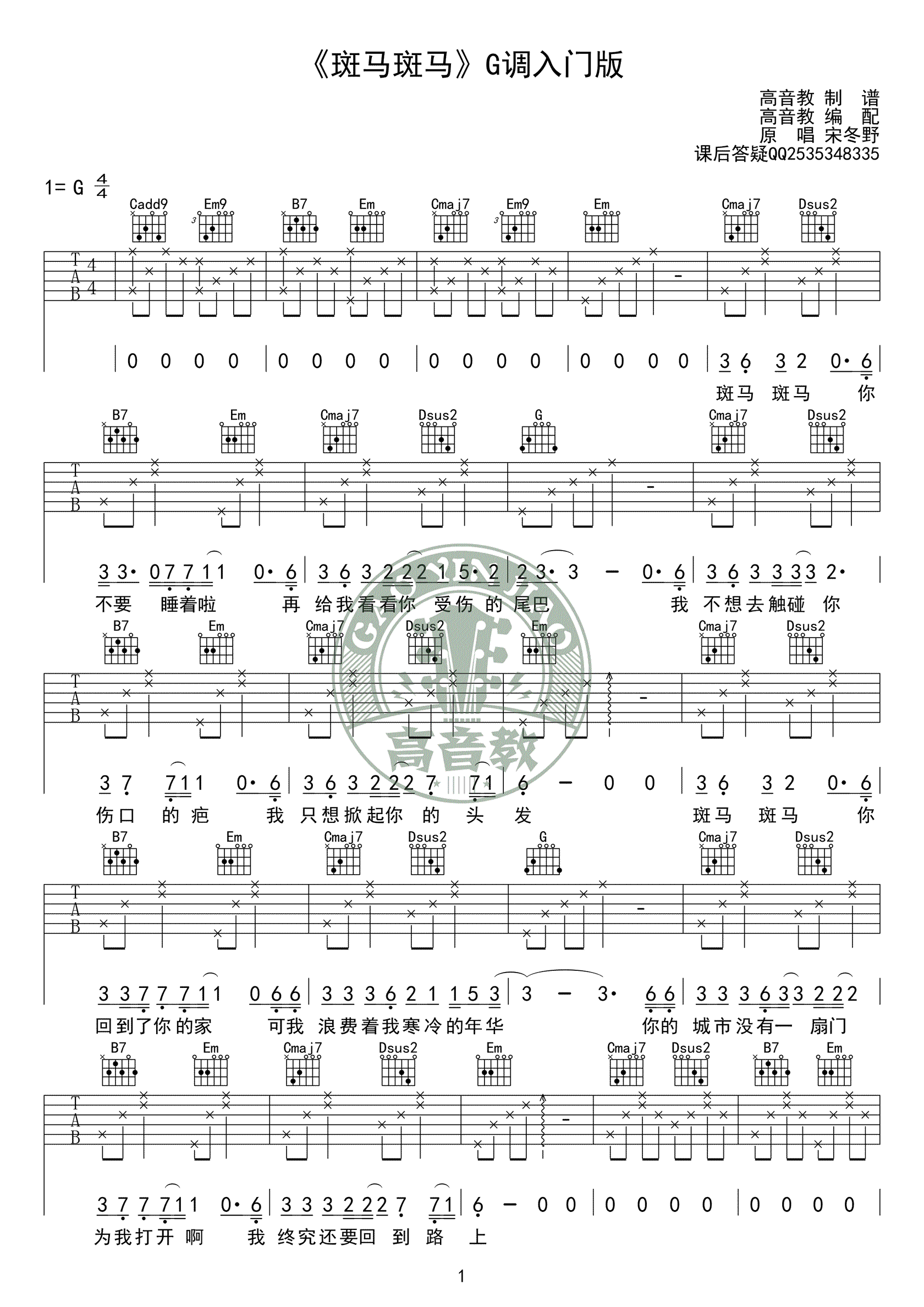 斑马斑马吉他谱 - 宋冬野 - G调吉他弹唱谱