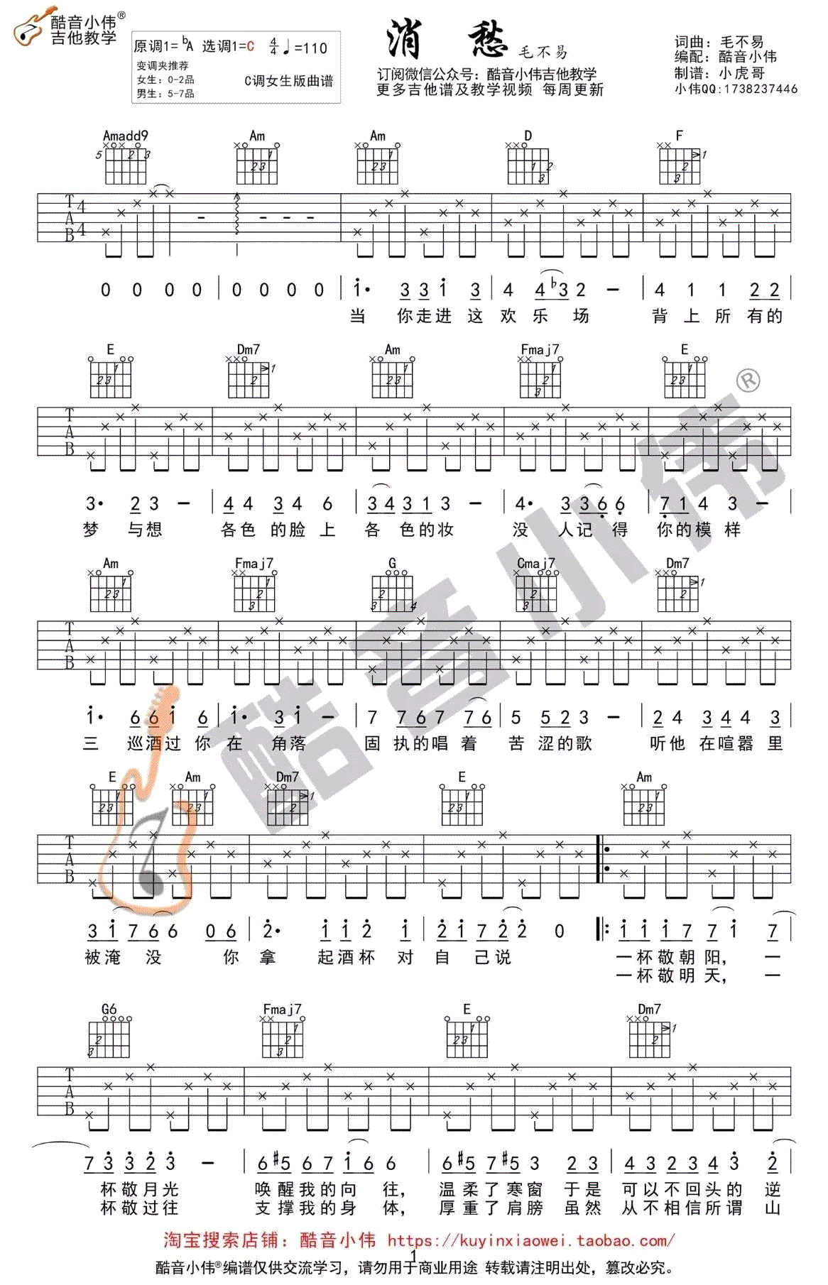 曲谱介绍: 消愁吉他谱,C调女生版,毛不易的这首歌曲很多人喜欢,为方便广大琴友,小伟老师编配了两个版本的吉他谱,G调指法的谱子更适合男生的声线,C调指法的谱子更适合女生的声线。91吉他谱已经上传网站,大家收藏练习起来吧。 G调男生版本的曲谱和吉他弹唱教学视频,可以点击左侧的图片链接直接打开浏览。