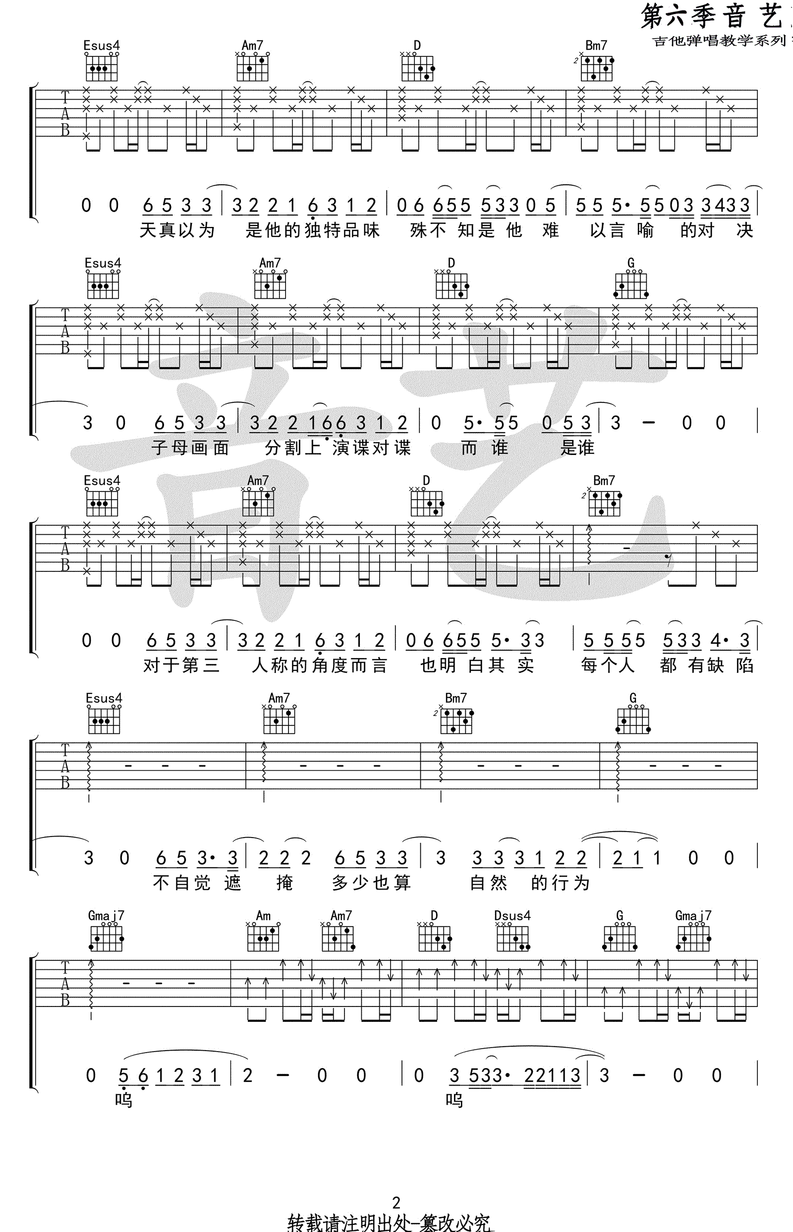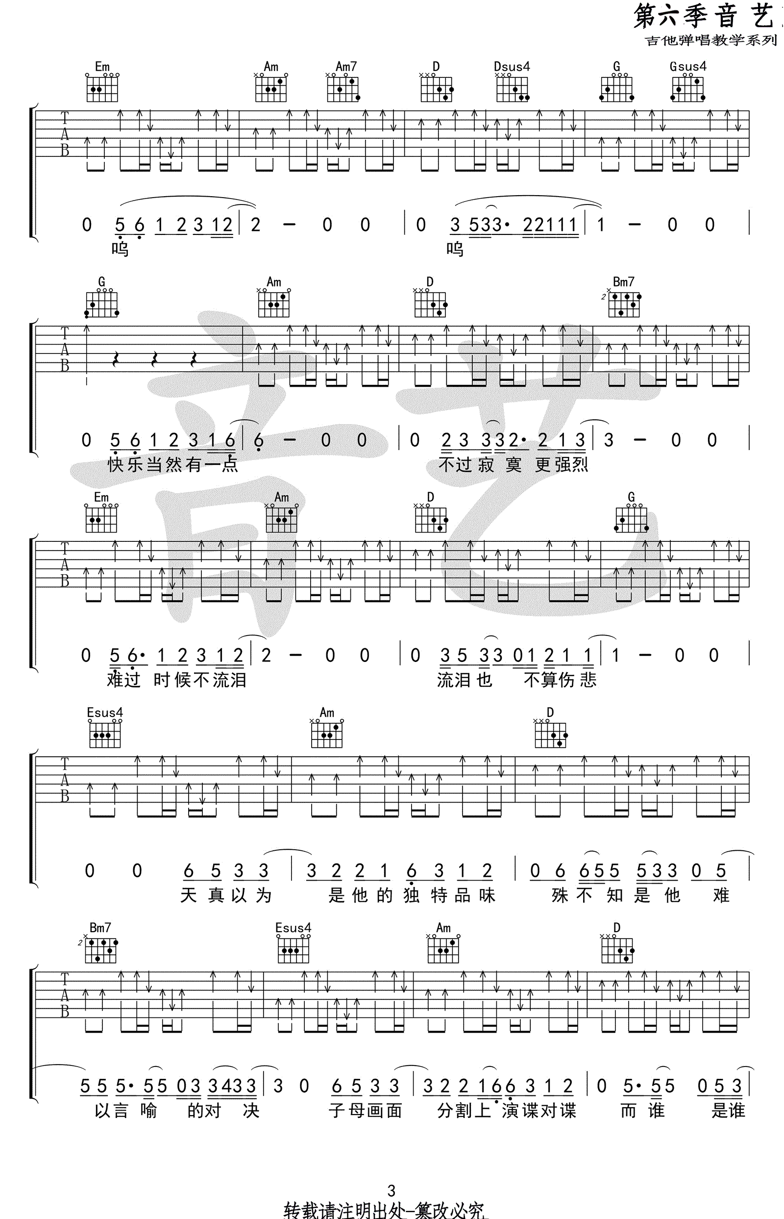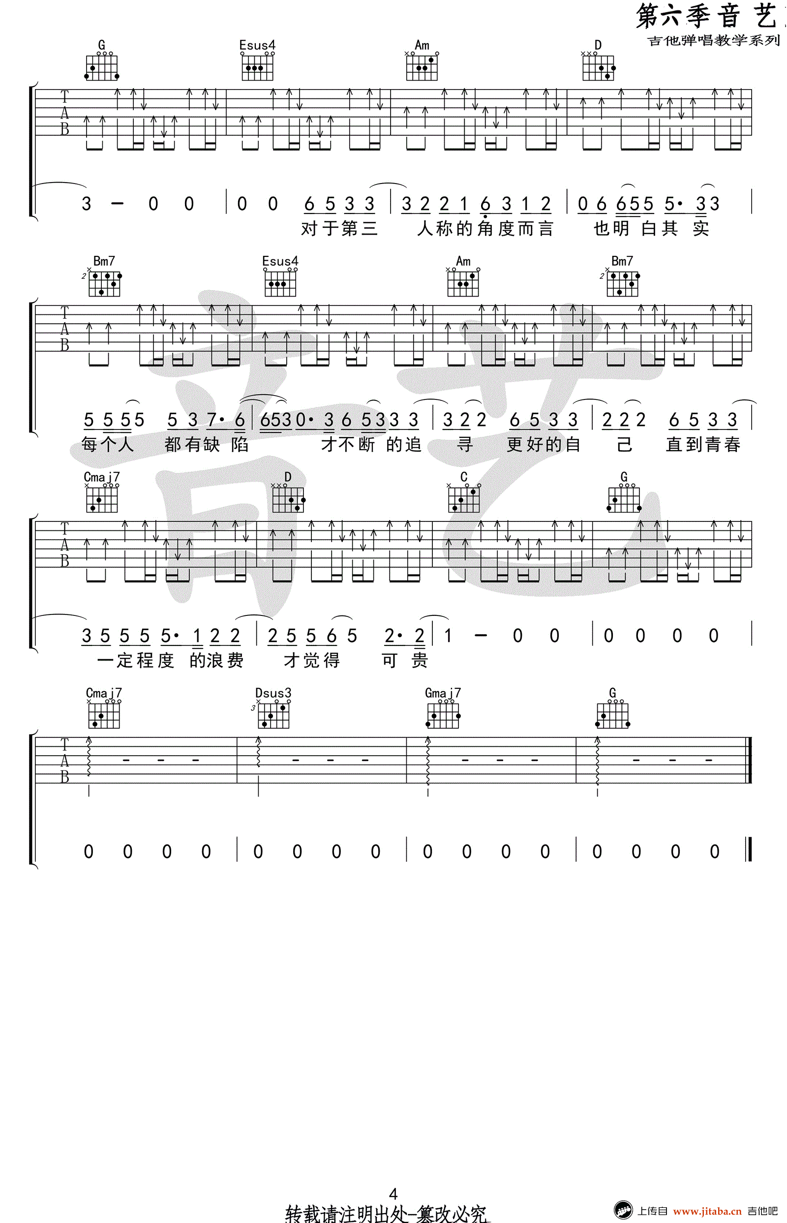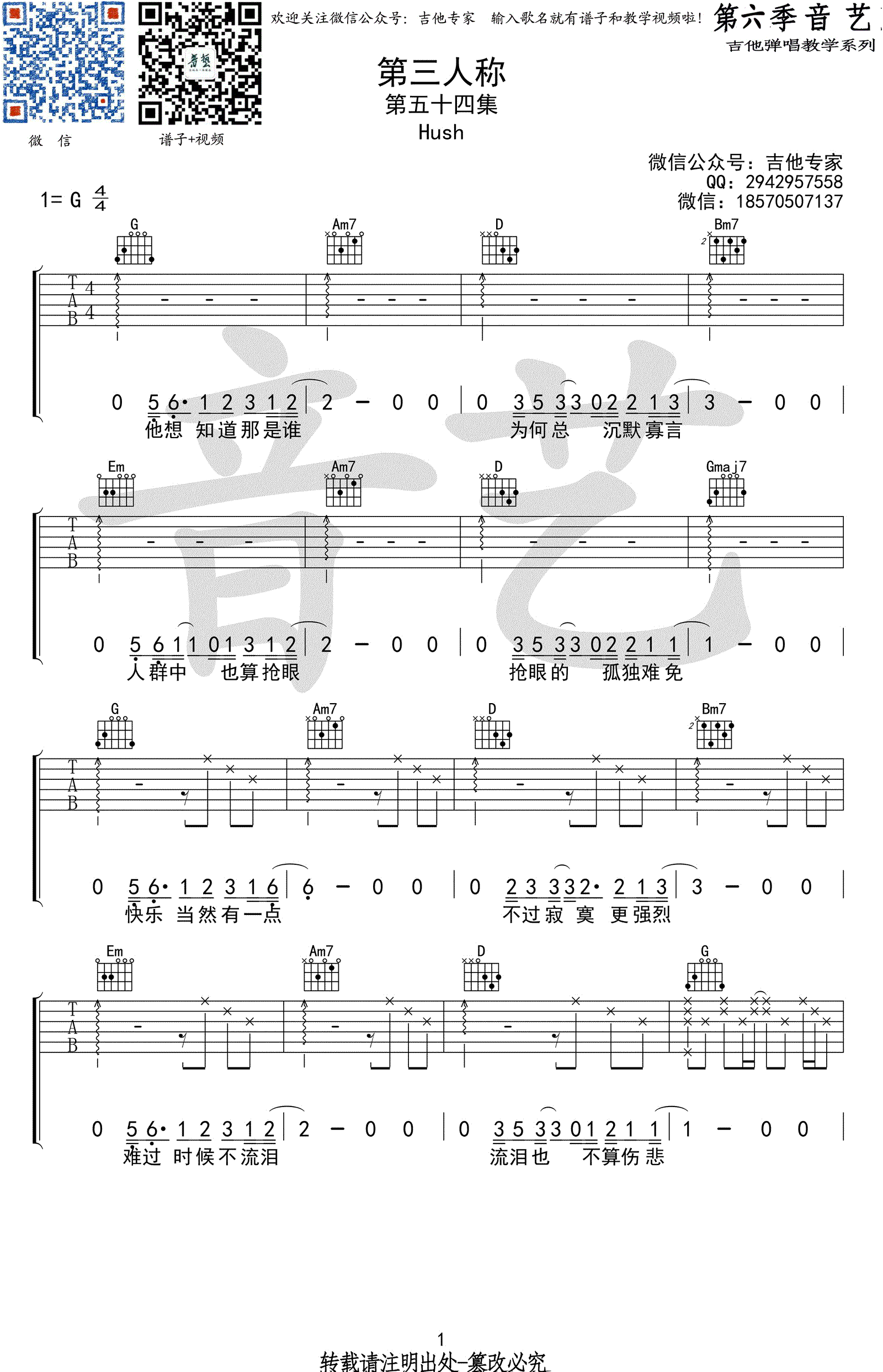 曲谱介绍: hush《第三人称》吉他谱,完整版四张高清图片谱,一首关于流浪者的歌曲,第三人称吉他弹唱谱,G调原版弹唱谱。音艺吉他出品,91吉他谱网站上传整理。 台湾歌手HUSH是非常有特质的音乐人,创作了许多诚恳的向听者和自我提问,并思考不同人生意义的歌。这首《第三人称》伴奏很随意,琴友们在弹奏时不需要按照谱子来,右手的节奏型可根据各自习惯和感觉来,只要拍子没有错就好!感谢摇滚猫老师编配!