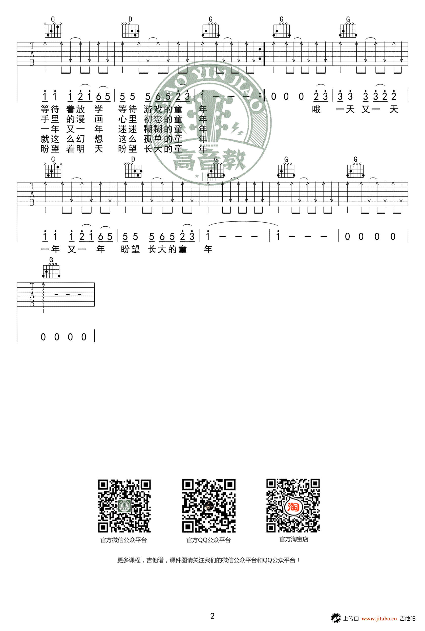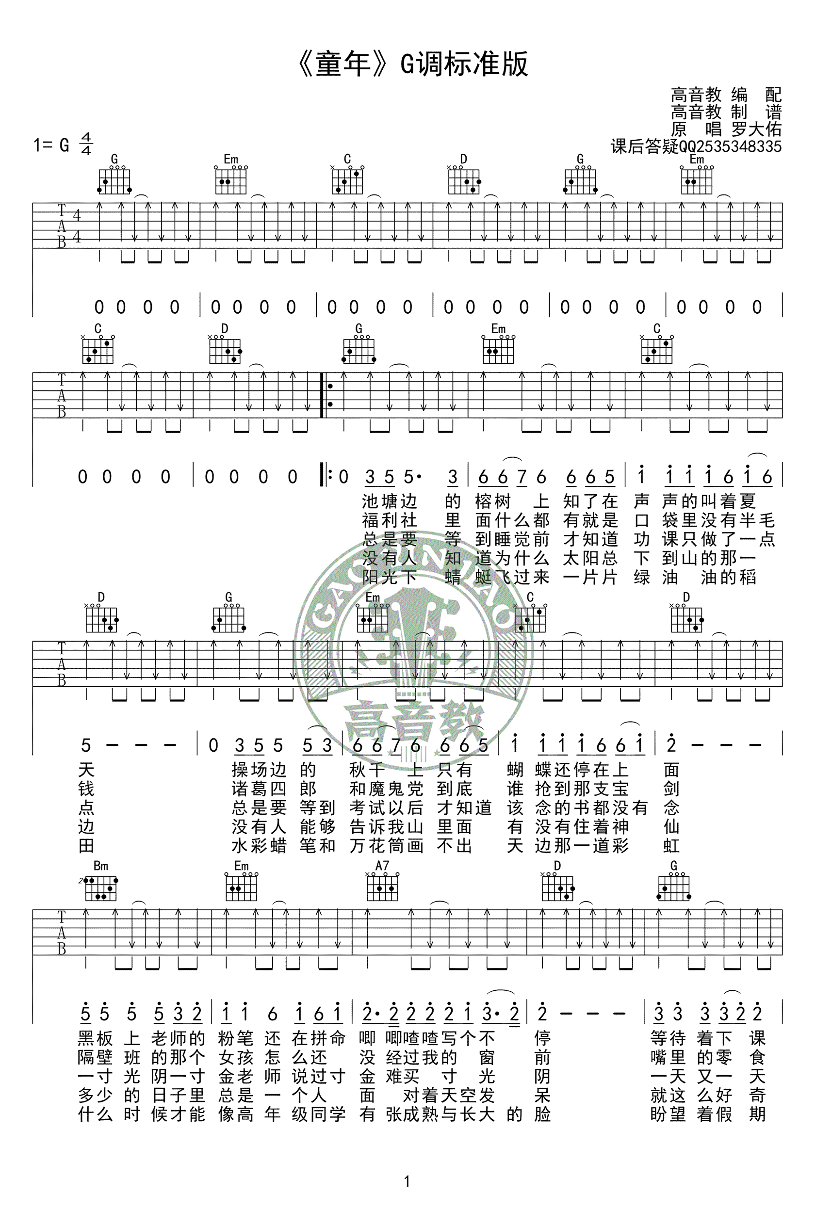 曲谱介绍: 罗大佑《童年》吉他谱,G调标准版,一首经典老歌,吉他弹唱必弹曲目。童年六线谱,高清弹唱谱,两张图片谱例。感谢高音教编配,并为琴友们带来吉他初级入门教程教学视频,91吉他谱网站整理上传。歌曲的教学部分在三分十五秒开始。和弦转换和扫弦方法参照老师讲解练习。