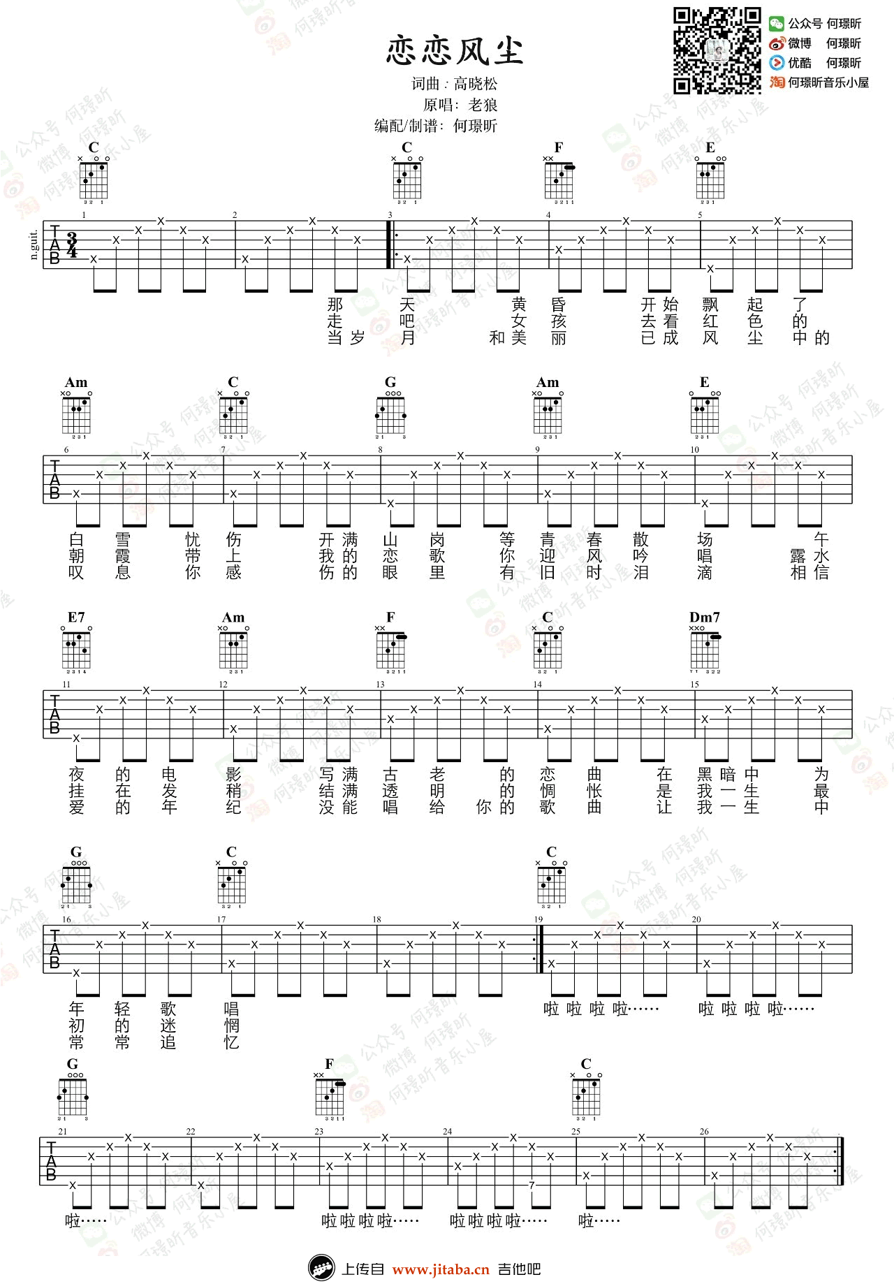 曲谱介绍: 恋恋风尘吉他谱,老狼的一首经典老歌,高晓松的校园民谣代表作品。恋恋风尘六线谱,高清图片谱,本曲谱为何璟昕编配制作,并为琴友们带来温婉柔美的女生版弹唱。91吉他谱网站推荐分享。 不从刻意想起和忘记,那迎风吟唱的、那不曾为你做的、突然就单曲循环在这首歌里,愿你能在旋律中梦见古老的年轻,梦见那段白衣胜雪的青春岁月。