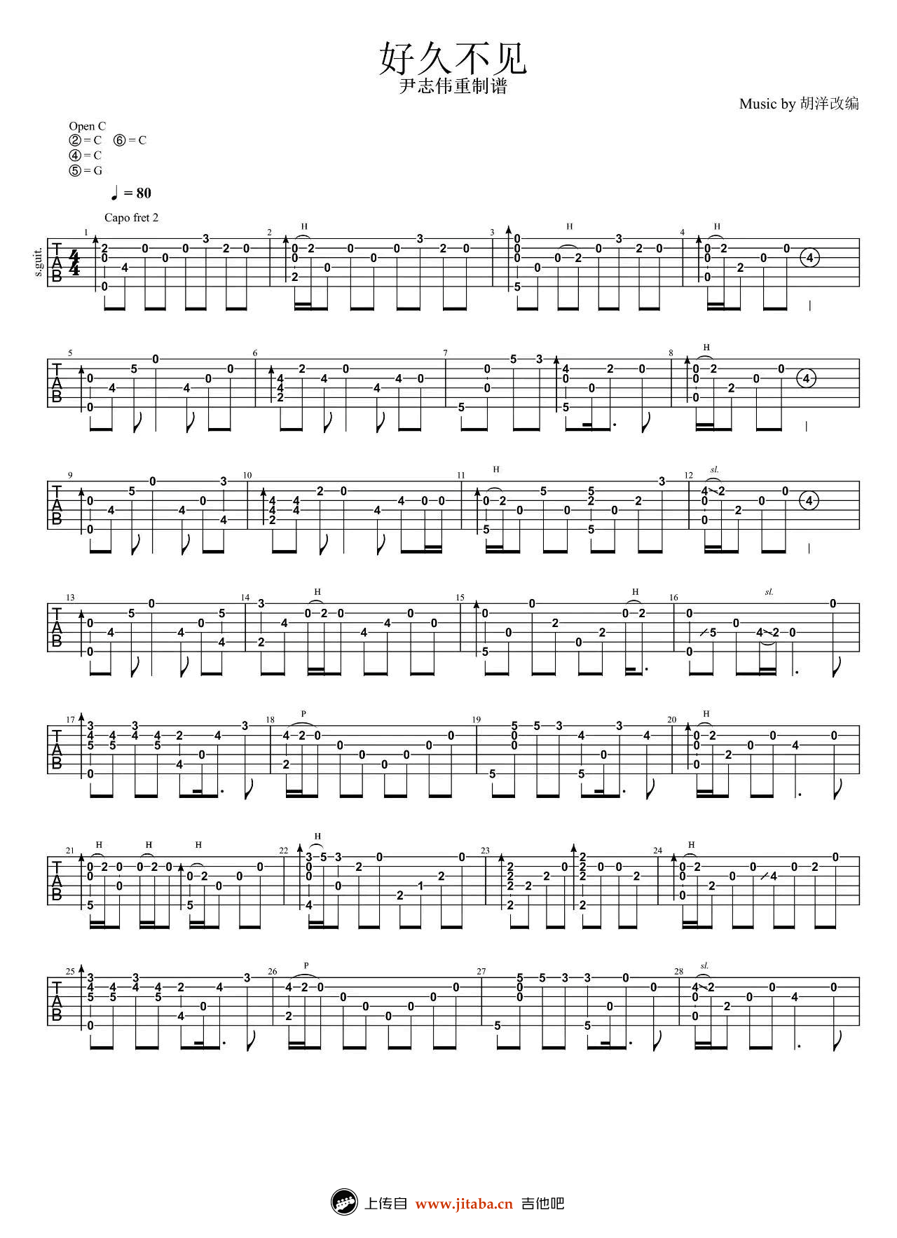 曲谱介绍: 好久不见指弹谱,E神的经典抒情之作,纯吉他演奏也很好。本次带来的《好久不见》是在胡洋老师编配的版本下稍作改动,更适合初学者。整曲采用OPEN C调弦:CGCGCE,变调夹夹二品演奏。 一首既好听又简单的经典指弹改编歌曲,随谱附上演奏视频。尹老师也准备了这首曲子的教学视频,感兴趣的琴友们可以关注91吉他谱(jitabacn)微信公众号学习和了解更多吉他曲谱和教学。