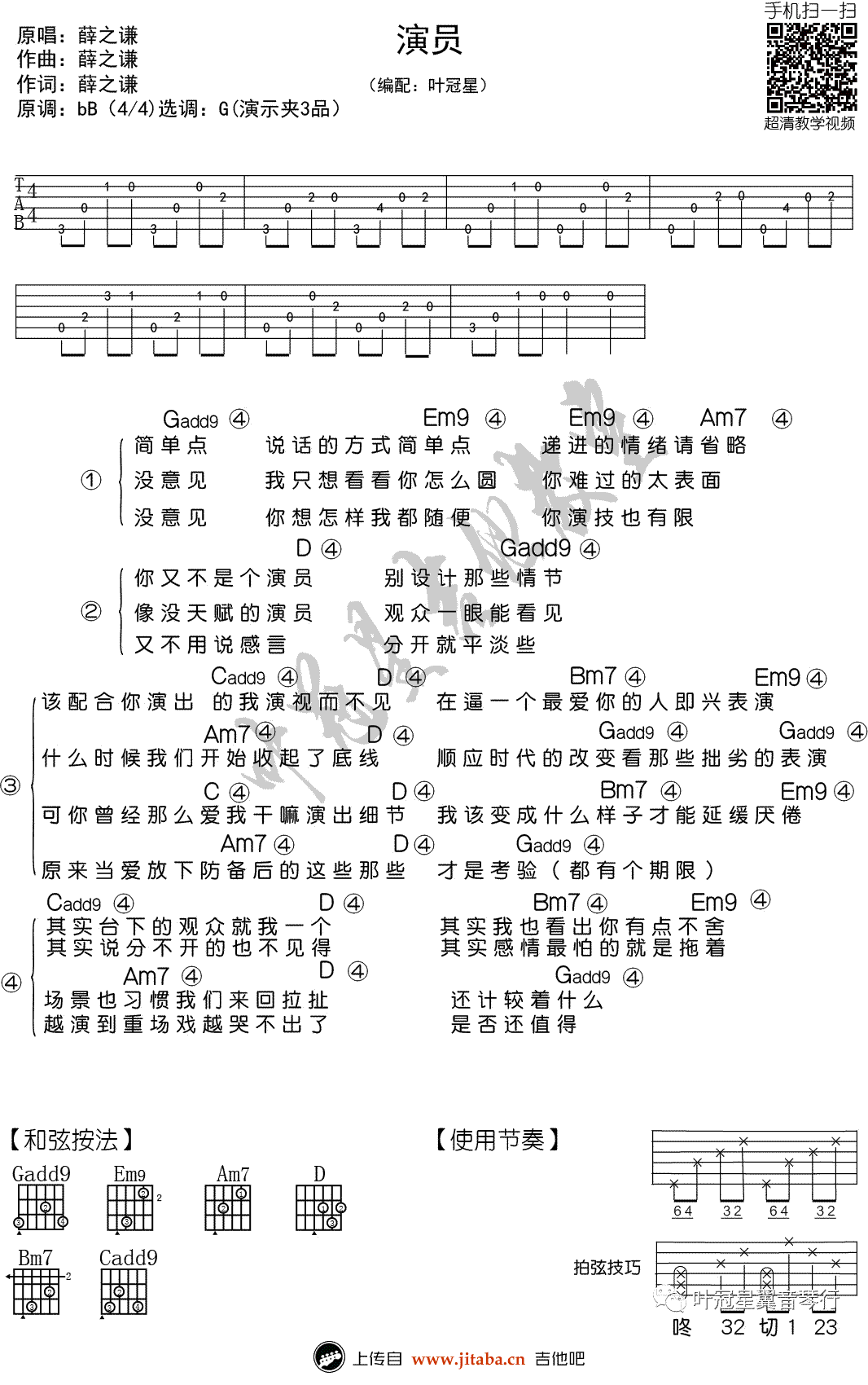 曲谱介绍: 演员吉他谱,配套教学视频,本次学习吉他弹唱《演员》打板技巧,打板技巧是吉他演奏中非常炫酷的加话技巧,它需要很扎实的吉他基本功才能练习,如对节奏拍子的稳定掌握,对于延音线的掌握等等。感谢叶冠星老师提供教学视频。 我们可先来练习分解节奏,然后在此基础上加上打板技巧,多加练习一定能掌握的!