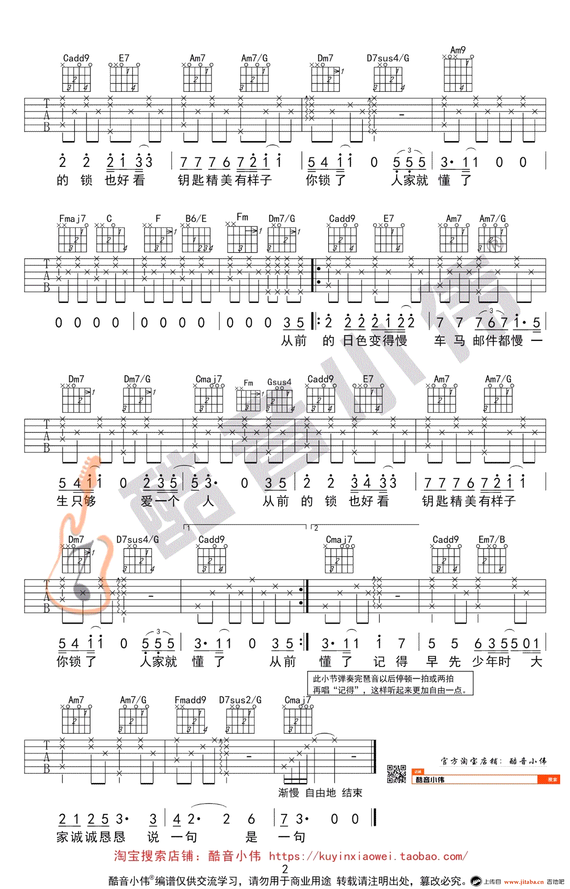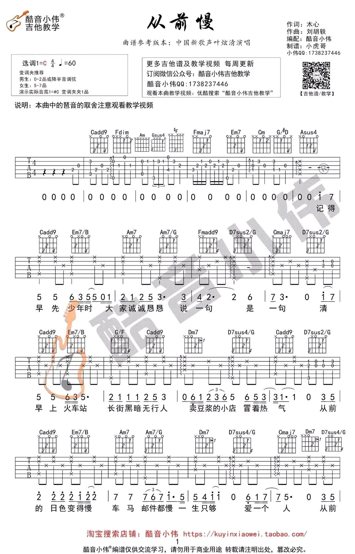 曲谱介绍: 《从前慢》吉他谱,中国新歌声叶炫清版本,从前慢六线谱,选用C调指法,变调夹男生推荐0-2品,或者降半音调弦,女生5-7品。感谢小伟老师带来曲谱,并送上《从前慢》吉他弹唱教学视频,演示中实际音高为#C调,变调夹夹一品。