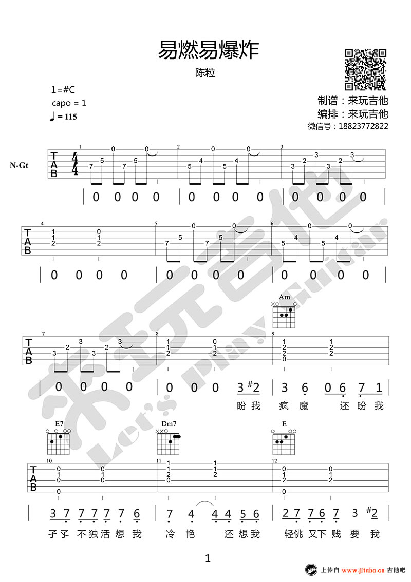 曲谱介绍: 易燃易爆炸吉他谱,陈粒的一首民谣歌曲代表作品,易燃易爆炸吉他弹唱谱,#C调,采用变调夹夹一品,六线谱编配,完整版七张图片谱例。感谢来玩吉他编排制谱,91吉他谱为琴友们上传推荐。 歌曲唱出爱情里的矛盾贪婪,勾勒出一个不寻找不依靠,骄傲地独自在风中开放的女子,​浸染在独特的唱腔里,有一种爆发边缘的压抑感,将你一圈圈围住慢慢下沉。