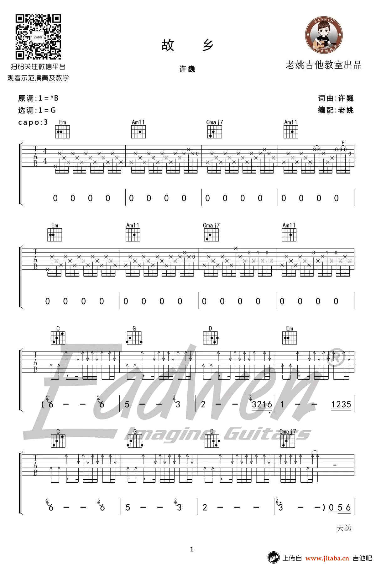 曲谱介绍: 许巍《故乡》吉他谱,原调降B,选调G调指法,CAPO夹三品。许巍特别经典的歌曲,故乡六线谱,弹唱谱高清版本,共四张图片谱。感谢老姚吉他教室出品,为琴友们带来弹唱教学视频。 这首歌曲难点在前奏部分,需要多注意节拍的把握,重点在三弦的音用点力,让它成为重拍。演奏的时候建议用拨片,大家可以跟随老师的讲解进行练习。