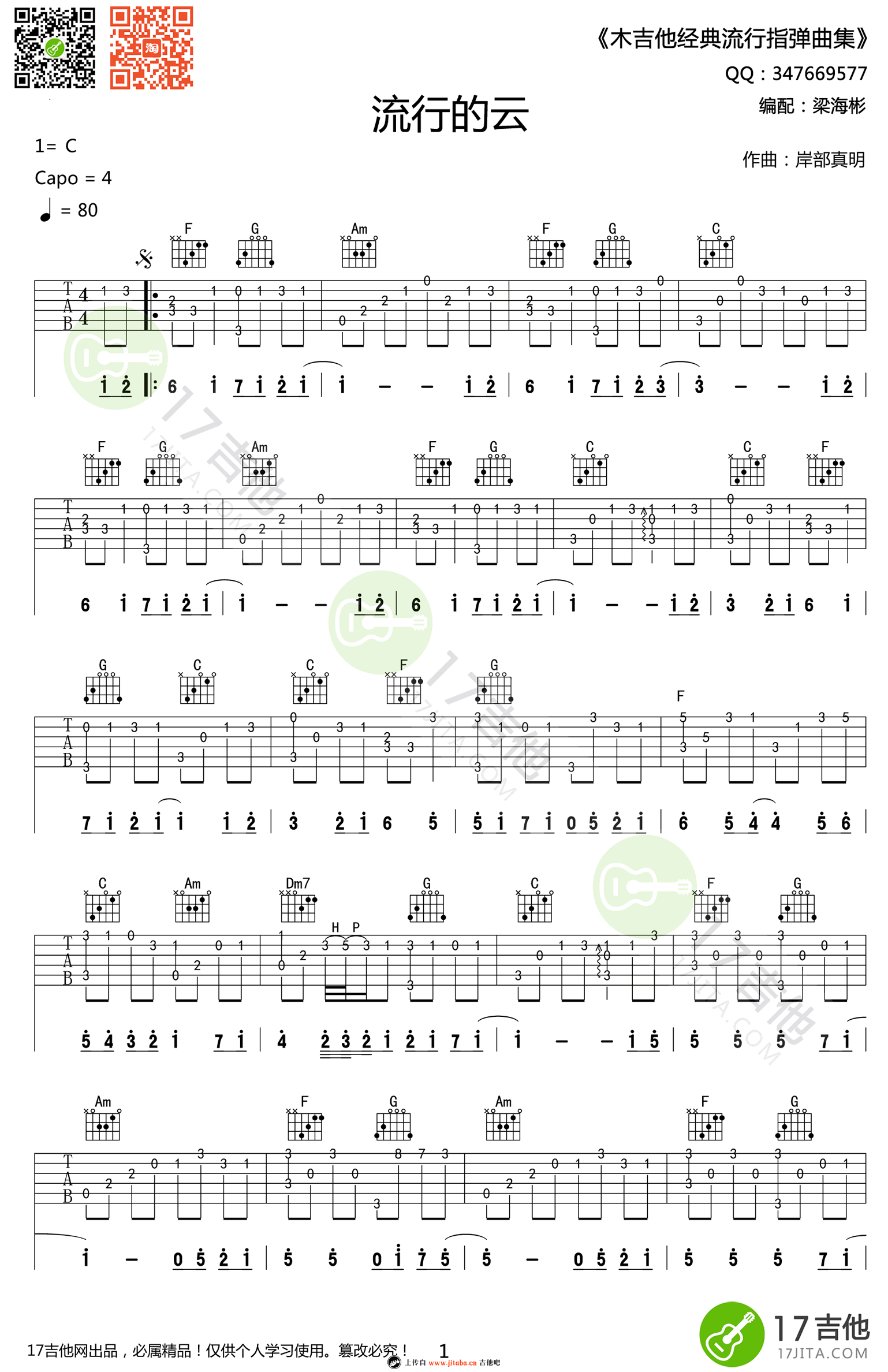 曲谱介绍: 岸部真明《流行的云》指弹谱,C调指法编配,变调夹夹四品,流行的云吉他独奏谱,标准音调弦。岸部真明的指弹吉他经典代表作品,旋律简单,又何其悠美忧伤平静。曲谱由梁海彬编配,高清图片谱方便琴友们收藏练习。