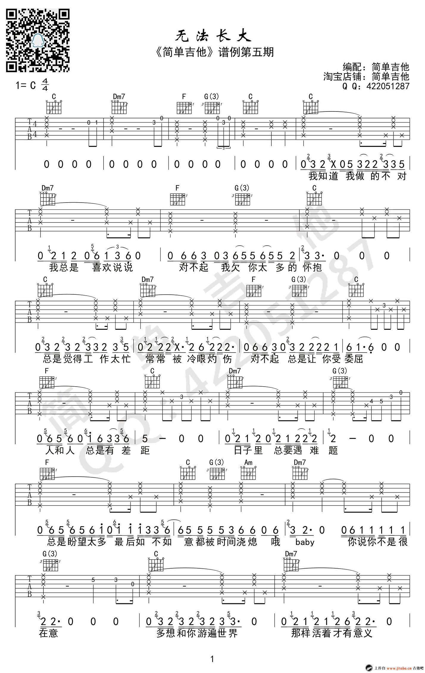 曲谱介绍: 赵雷《无法长大》吉他谱,C调完美版,简单吉他编配。无法长大吉他弹唱谱,高清图片六线谱。赵雷的这首新歌一如既往延续以往的音乐风格,自然舒缓的旋律,简朴无华的歌词,一把吉他唱出我们的故事,以及那些不知所措的挣扎和无所适从的爱情。青春欢乐时光总是匆匆,我们每一个人不可避免的在慢慢长大。只愿保留初心,仍然满怀热情。 91吉他谱(www.jitaba.cn)网站其他编配版本: 无法长大吉他谱C调_赵雷