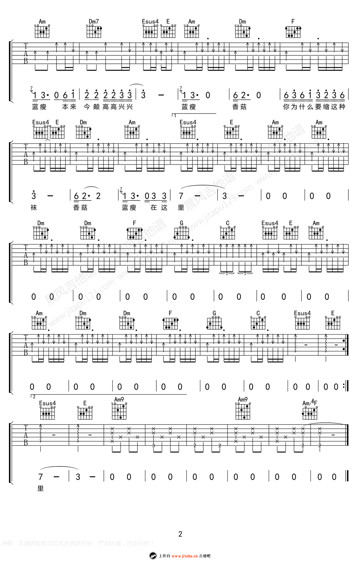 曲谱介绍: 蓝瘦香菇六线谱,C调指法编配,蓝瘦香菇吉他谱,高清图片谱。新一代红遍网络的神曲,由广西南宁失恋青年作词。蓝瘦香菇在琴声中得到了升华,唱出了想爱却爱不到的那种痛楚,既然选择悲伤欲绝,就不要欲罢不能,正是这种矛盾的心情才不经意间把失恋者的伤心表现的淋淋尽致,如果说林宥嘉的歌是苦情歌的一种代表,那么蓝瘦香菇就是另一种苦情歌的诠释,只不过林宥嘉的苦是咖啡放多了,而蓝瘦香菇的苦则是药放多了。