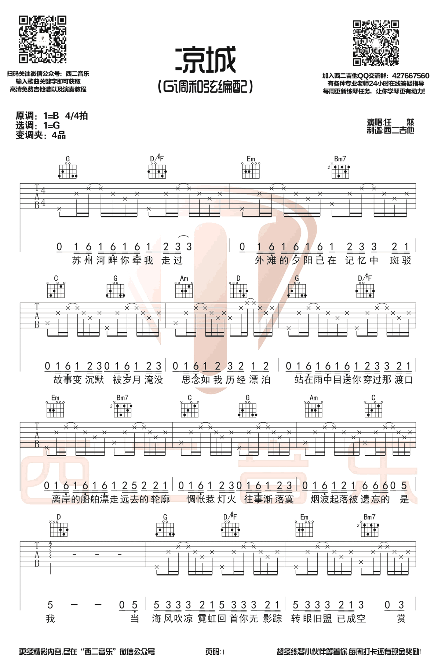凉城吉他谱 - 任然 - G调吉他弹唱谱 - 和弦谱
