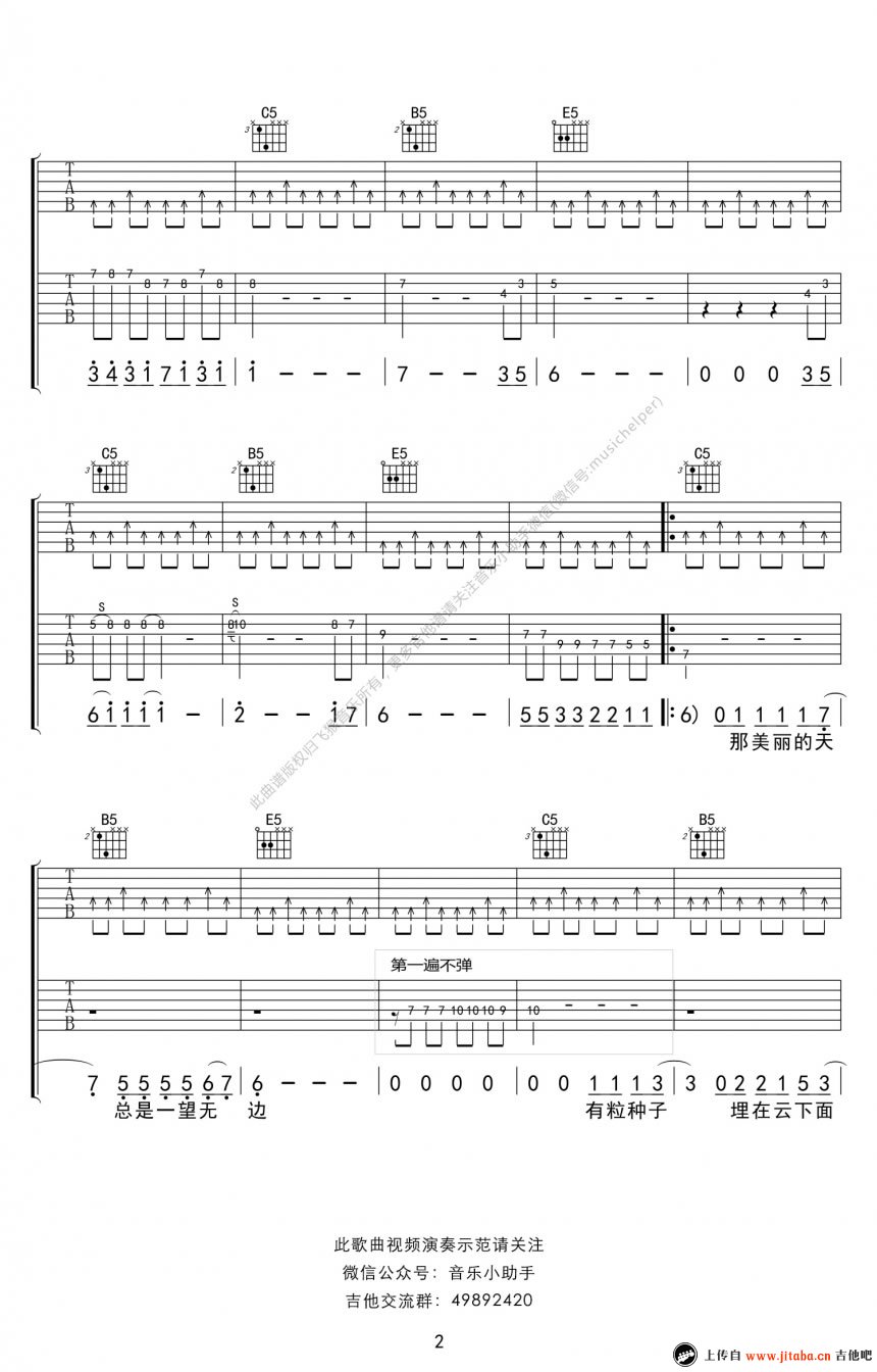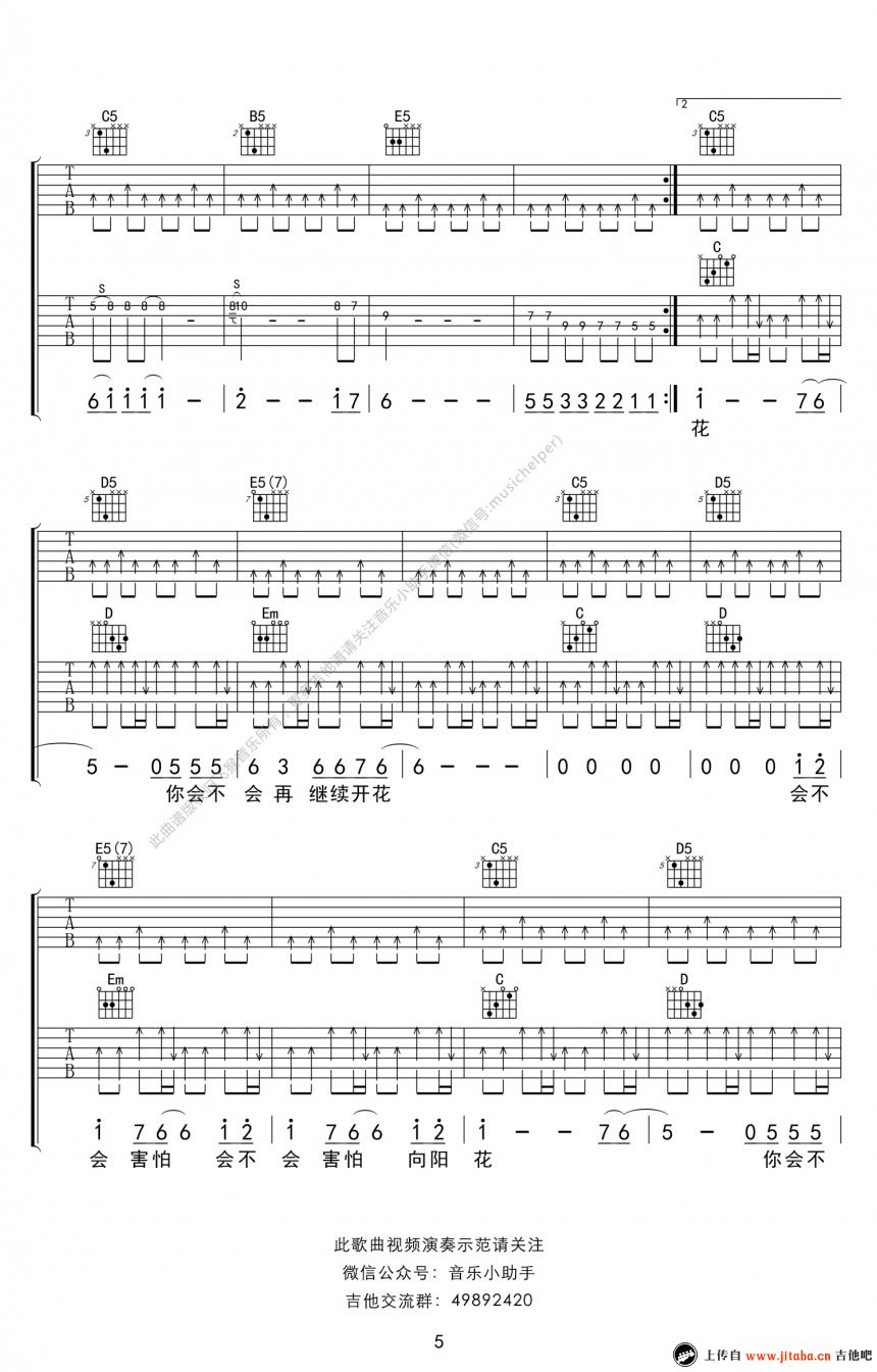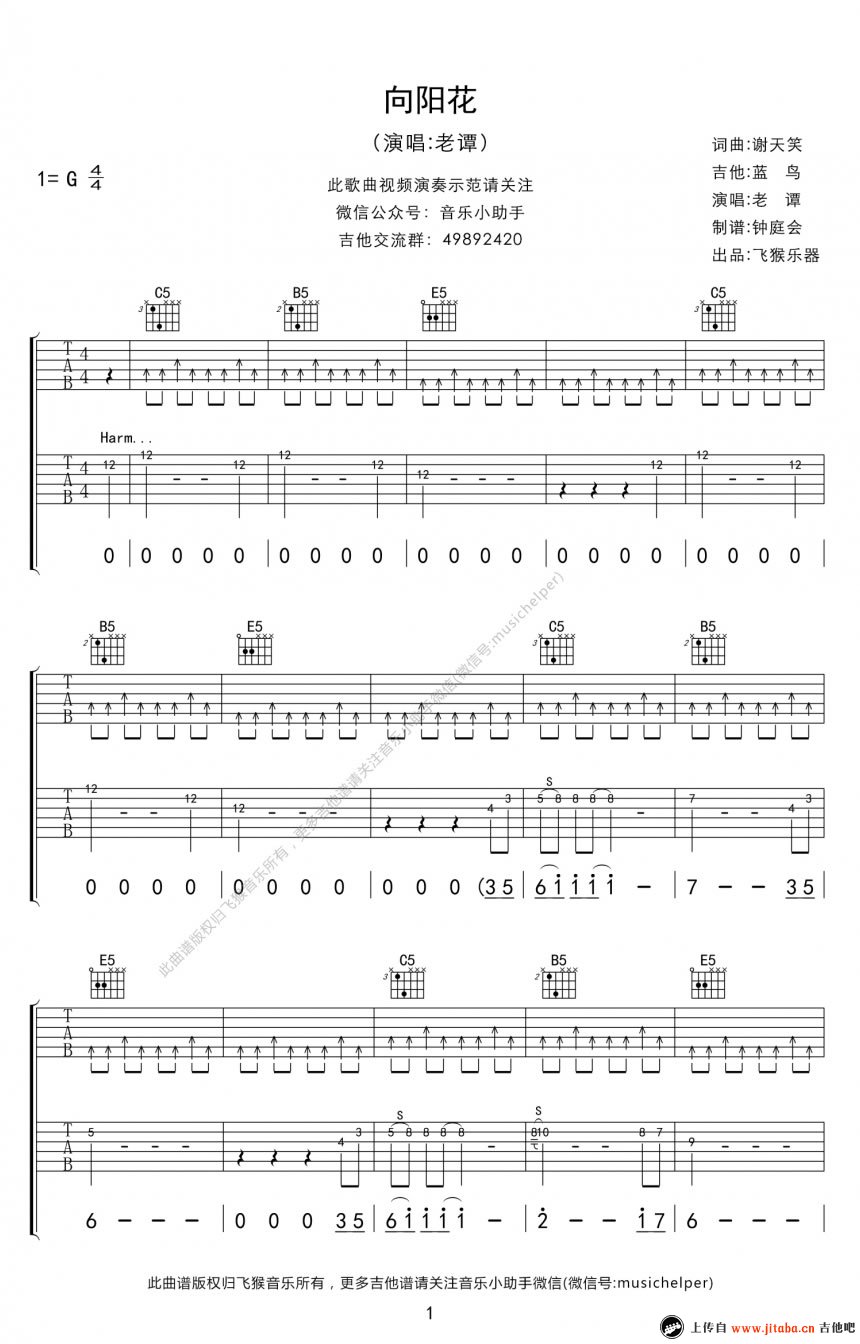 曲谱介绍: 谢天笑《向阳花》吉他谱,G调指法编配,向阳花六线谱,高清图片谱,完整版共六张谱例两页显示。一颗种子,无论再卑微与不济,也要生长发芽,只有你自己才能给你更好的生活,不论生活再多挫折与不幸,做一朵向阳花吧。感谢摇滚、还有老谢。91吉他谱网站(www.jitaba.cn)为您推荐。
