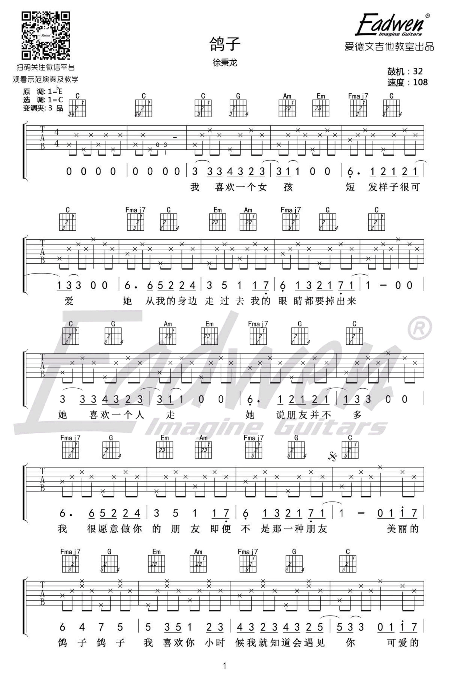 曲谱介绍: 原调bE,选调C,变调夹夹三品。鸽子六线谱,高清图片谱,感谢陈佰老师为同学们带来曲谱配套吉他弹唱教学视频。温柔的情歌,浪漫的表白,喜欢的短发女孩,一份纯粹的爱。