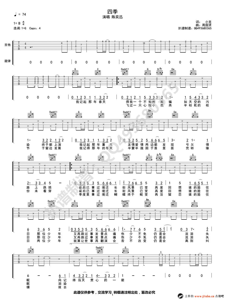 曲谱介绍: 陈奕迅 四季吉他谱,原调B选调G,变调夹夹四品。四季吉他六线谱,图片谱格式。陈奕迅的一首新歌,温暖好听的粤语单曲,国语版《I DO》。整首歌像说故事,每一段歌词段落,如一个季度,交织成不同的人生。而这些故事,可以是我的回忆,也可以是你、他和她的经历。《四季》吉他弹唱,充满人生哲理的歌。 陈奕迅《四季》吉他谱_G调和弦谱