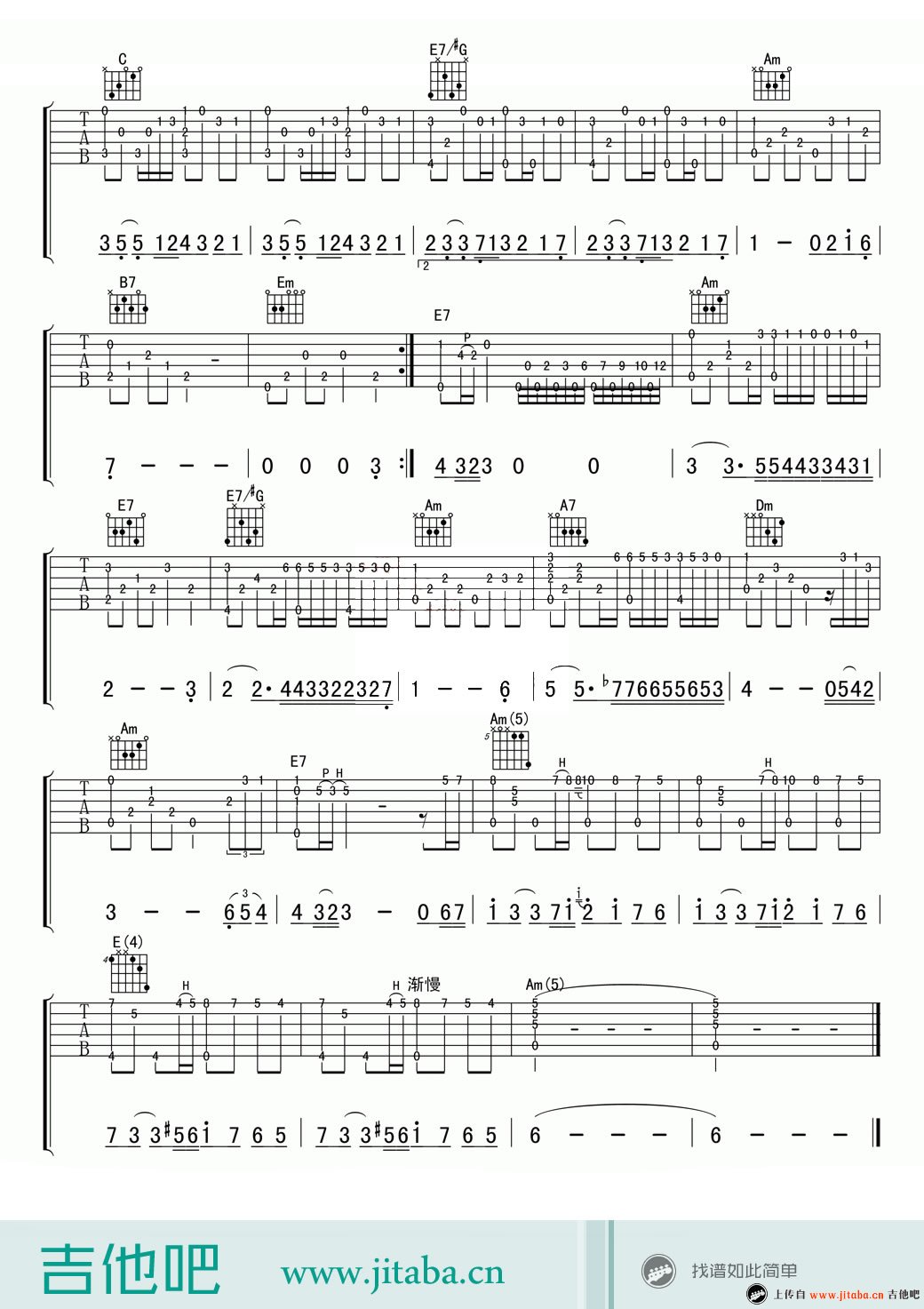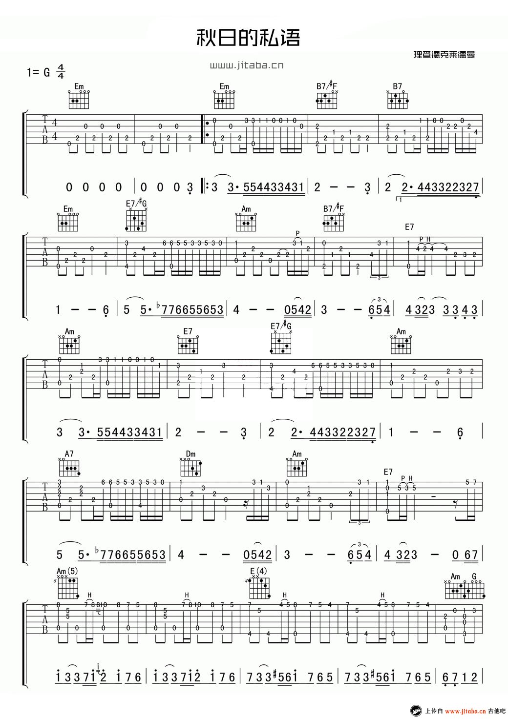 曲谱介绍: 秋日的私语吉他谱,指弹独奏曲谱,高清图片谱,理查德克莱斯曼钢琴曲改编,秋日的私语指弹谱,G调编配。一曲《秋日的私语》仿佛带引我们进入了如诗如画的梦境中,美妙的旋律静静地流淌过每个细胞。 指尖轻拨的琴音,给我们的精神世界带来了让人心悦的美景和享受,让我们的心灵也像画中的行云流水,温柔地流淌于大自然间。91吉他谱 www.jitaba.cn 推荐其他编配版本,供琴友们练习参考: 秋日的私语吉他谱_经典吉他独奏曲 秋日的私语吉他独奏谱 指弹谱