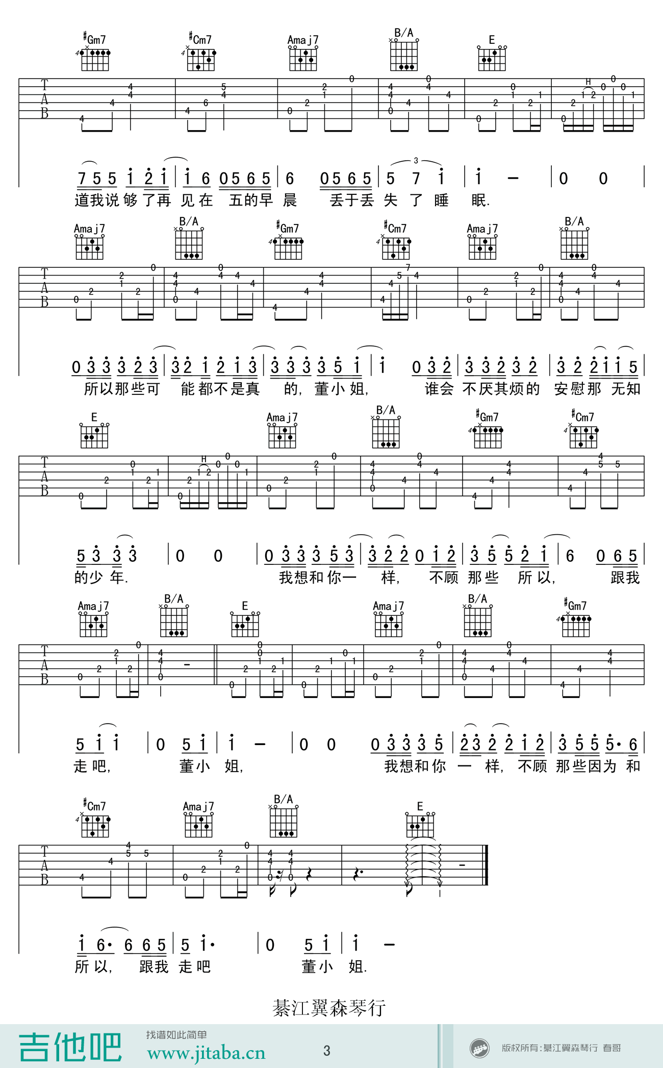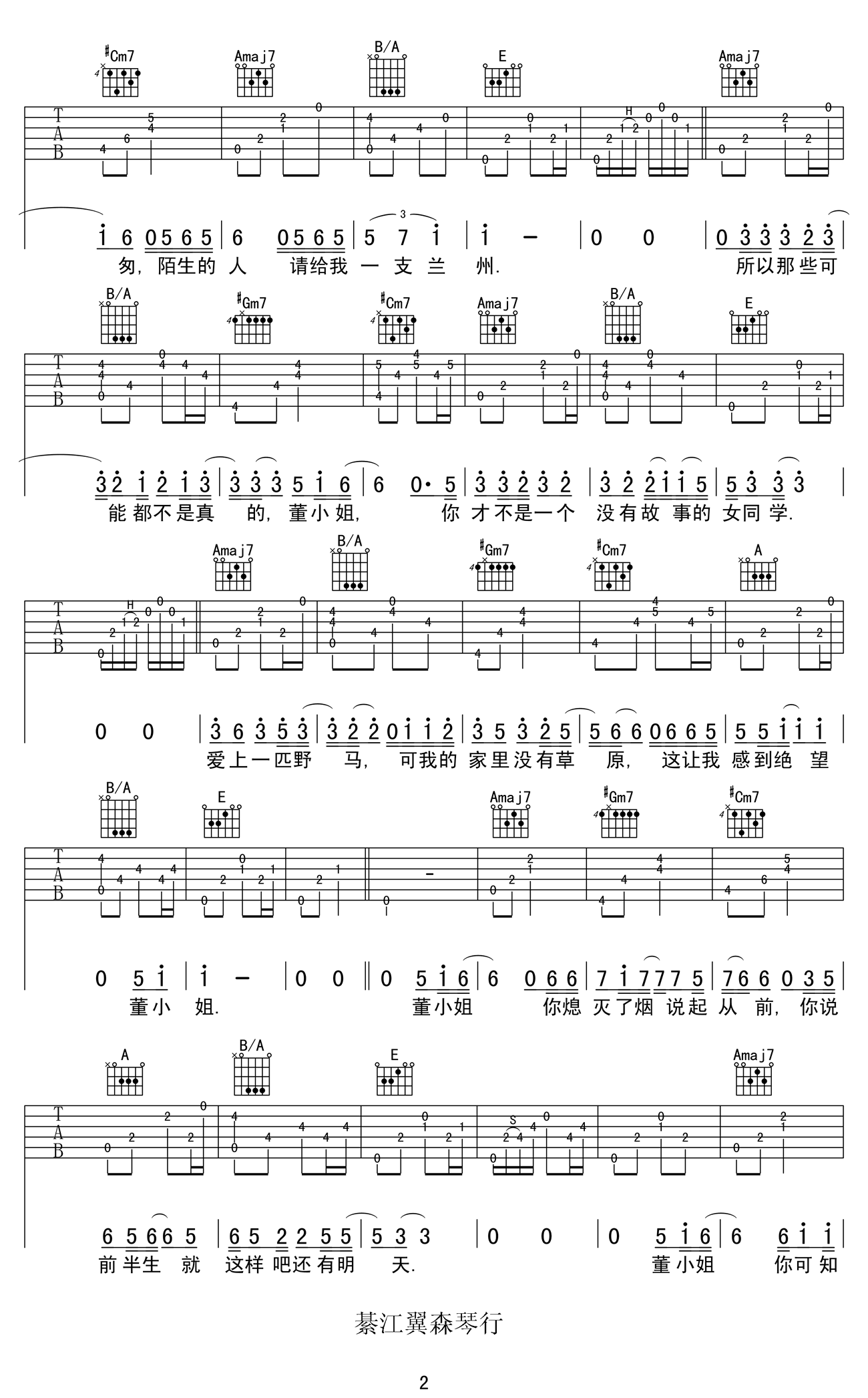 曲谱介绍: 宋冬野《董小姐》吉他谱,六线谱图片高清版,董小姐吉他弹唱谱,感谢綦江天籁琴行春哥制谱。