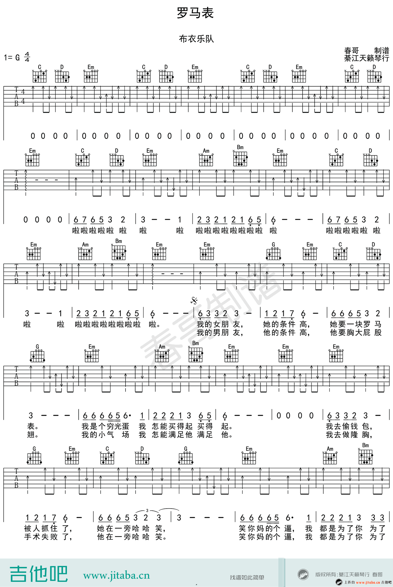 曲谱介绍: 布衣乐队《罗马表》吉他谱,布衣乐队演唱,曲谱为六线谱,G调编配,高清图片谱。罗马表吉他谱,感谢綦江天籁琴行编配分享,91吉他谱网站推荐。让我们一起弹唱中首布衣乐队《罗马表》,有时候,千言万语道不尽的委屈,不如一句脏话来的痛快。